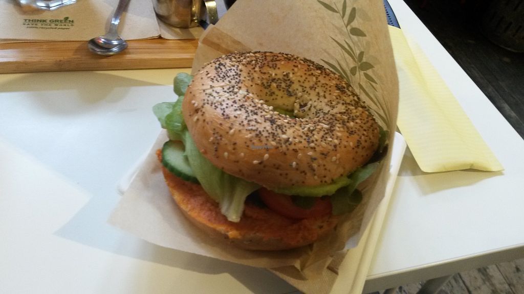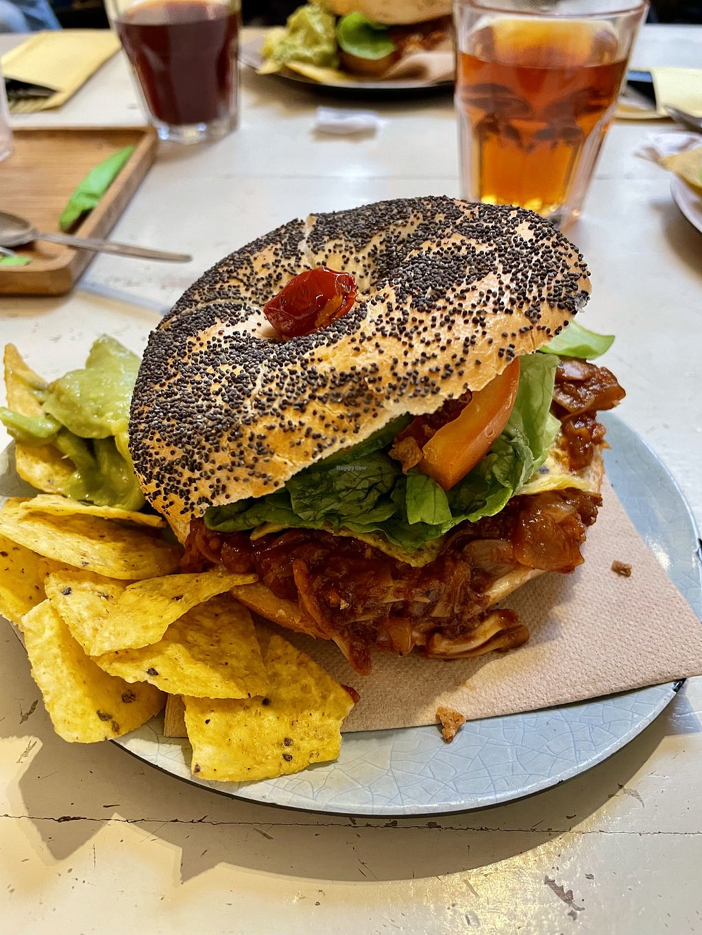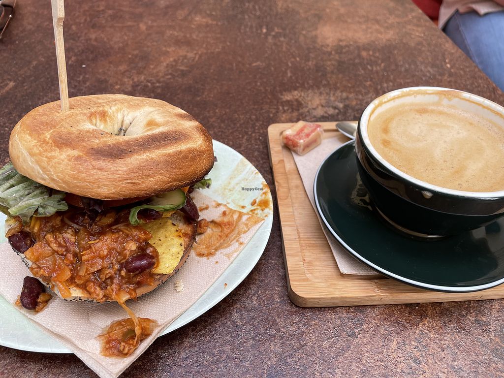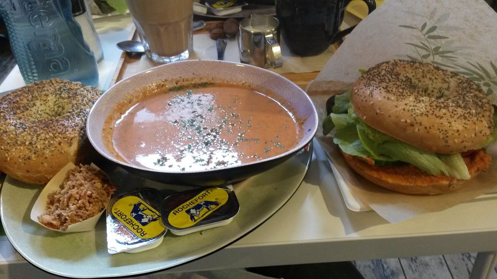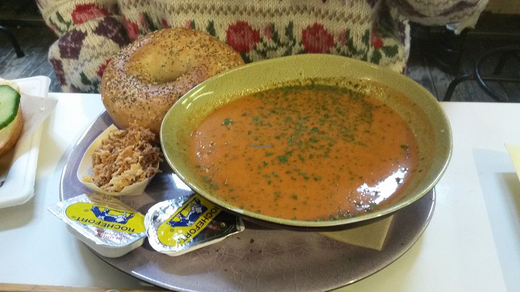Soup (with bagel) and vegan bagel. We love bagels. Ignore the butter p…