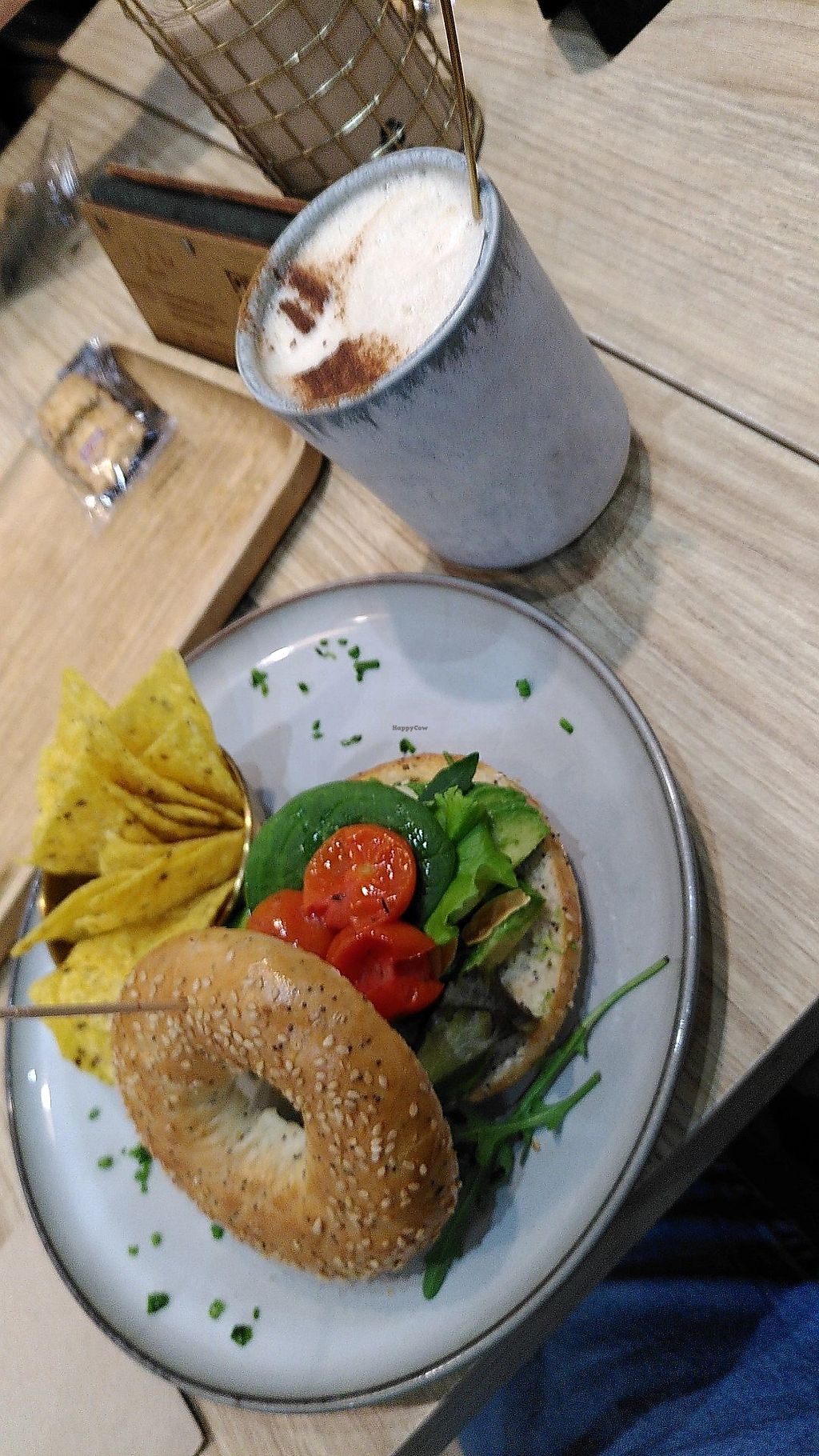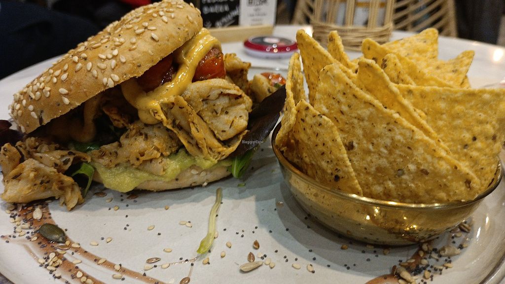 Bagel with heura, guacamole, cherry tomatoes and sauce of mango