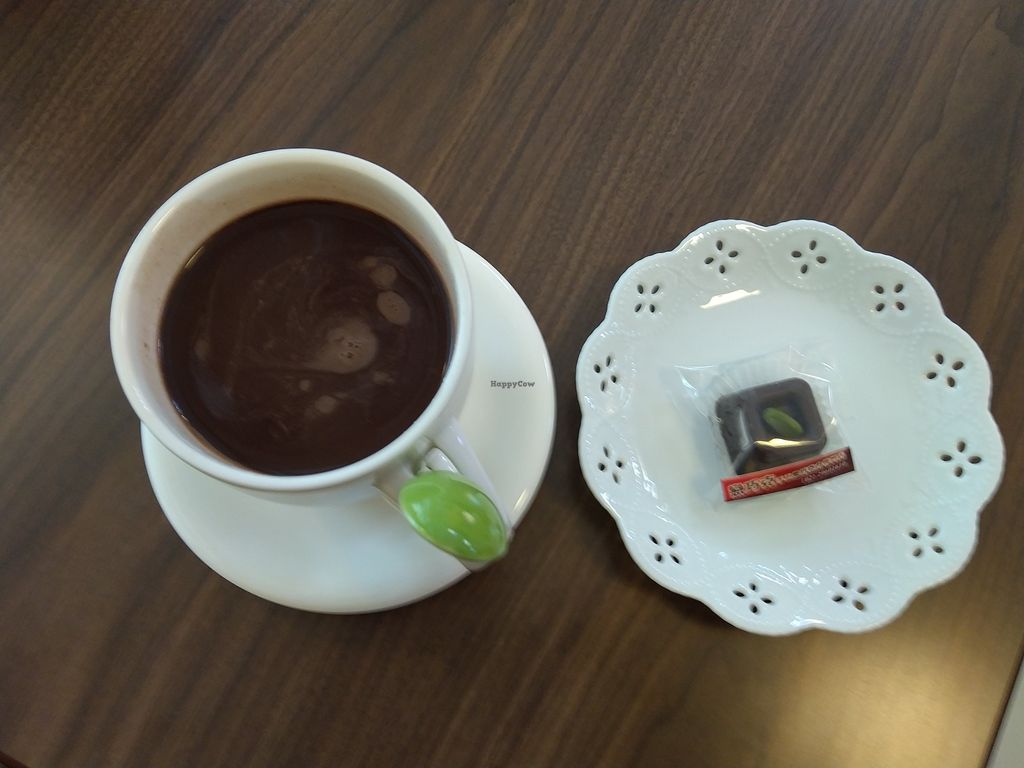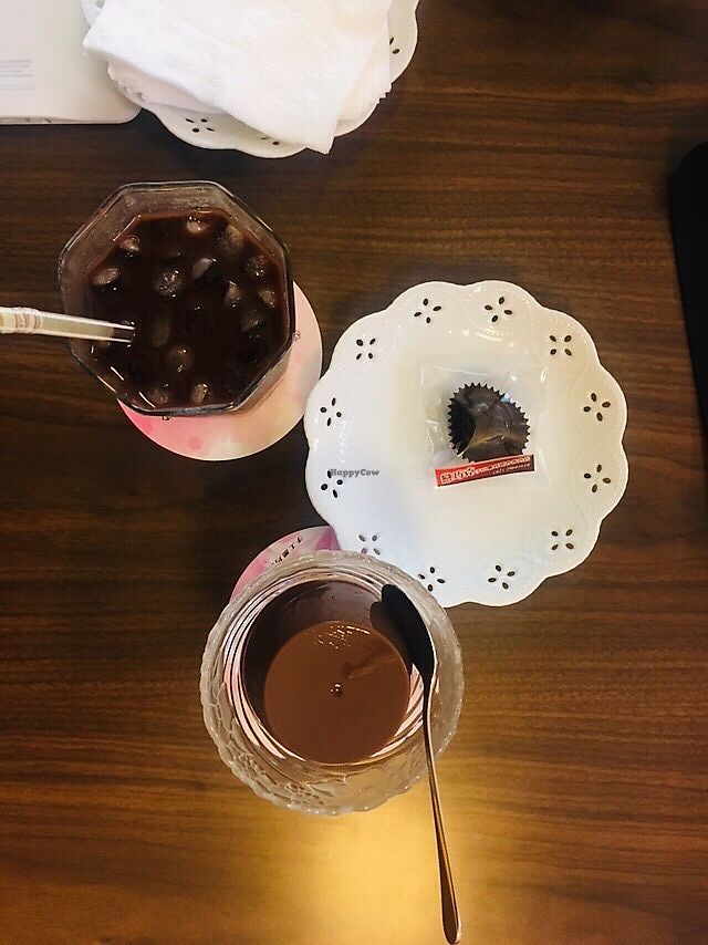 Ice chocolete, small piece of chocolete(served with beverage), pudding