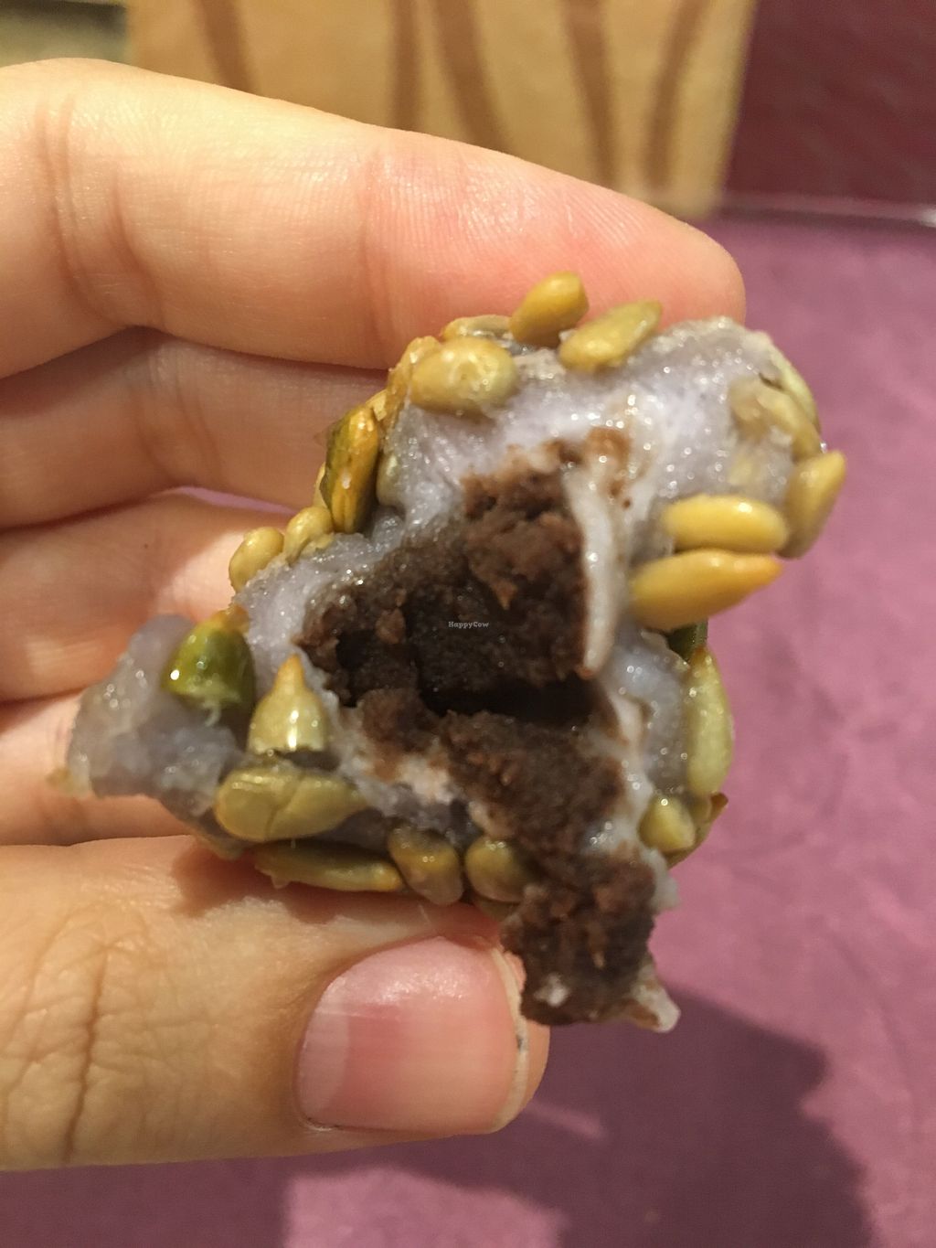 inside the purple dumpling thing, red bean with sunflower seeds outsid…