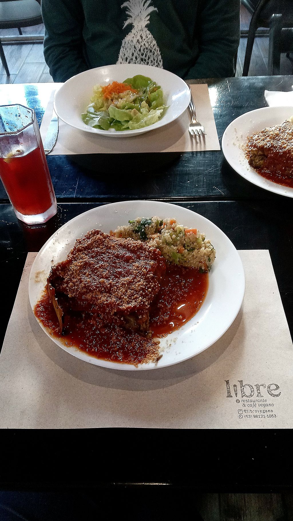 Comemos uma lasanha de bolonhesa de lentilha maravilhosa, acompanhada de quinoa e salada. Voltaremos no Libre sempre que viermos a Pelotas!