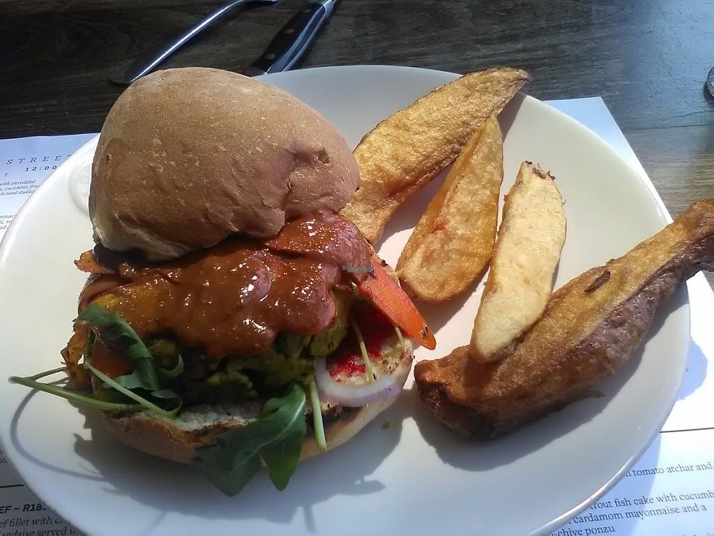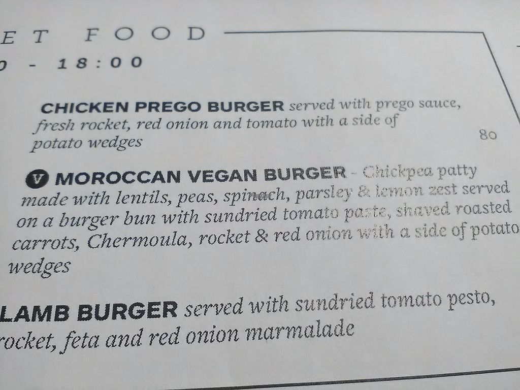 There is a wide selection of vegetarian dishes, quite a few of them are actually vegan. I had the Moroccan Vegan burger which, even though not the best burger I've ever eaten, for the price, is actually very well served and abundant. Waiters are friendly and knowledgeable, they know the difference between a vegetarian and a vegan and the menu itself says the vegetarian dishes can be veganised. They have a partnership with a beauty shop called Beauty Factory and every time someone eats there, they are given a voucher to have a free hand rub at Beauty Factory. Beauty Factory doesn't test on animals and is very committed to recycling. So it was a good "dessert" after my meal. :)