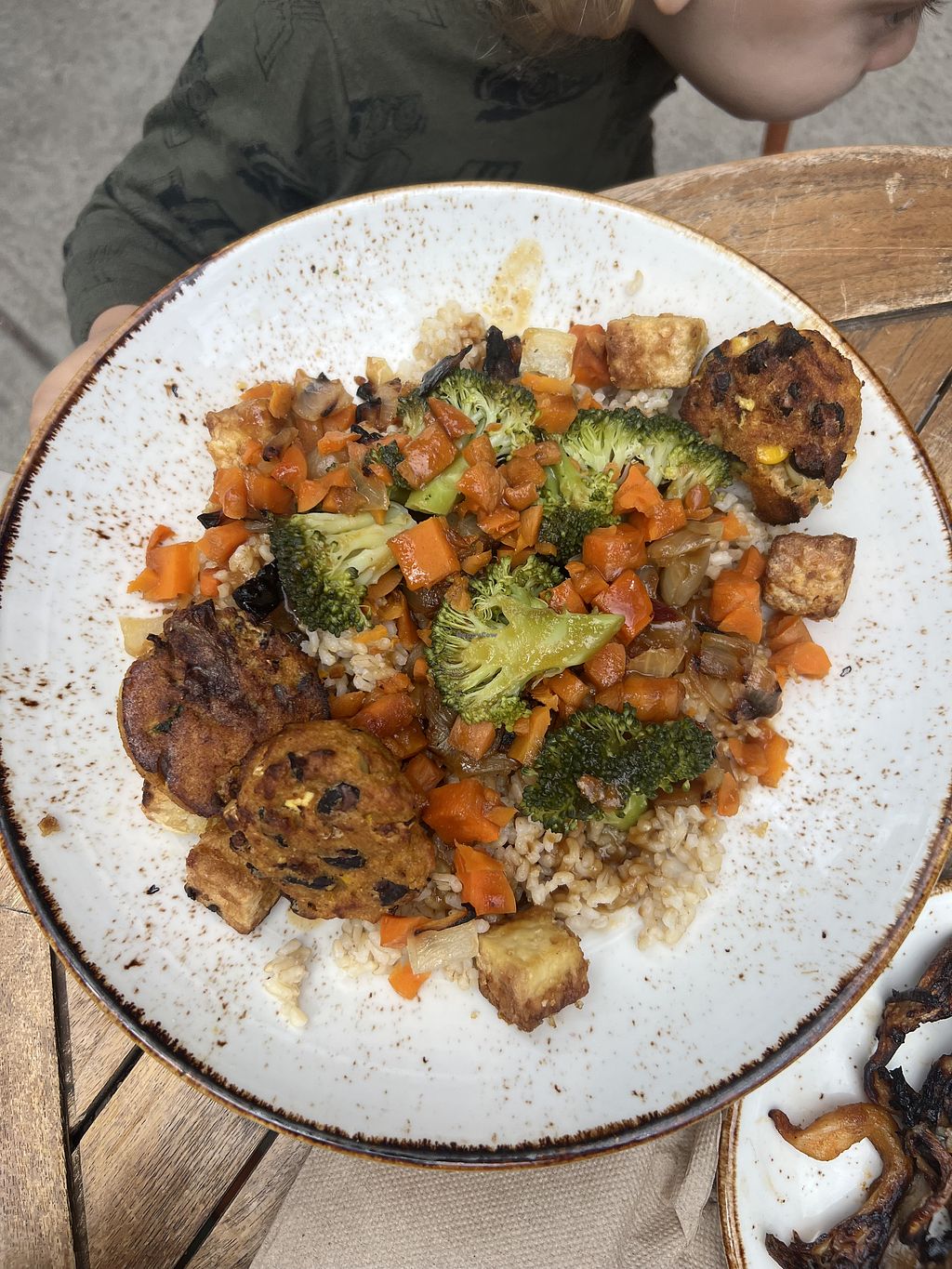 Teriyaki tofu with added fritters (spicy mushrooms on the side out of …
