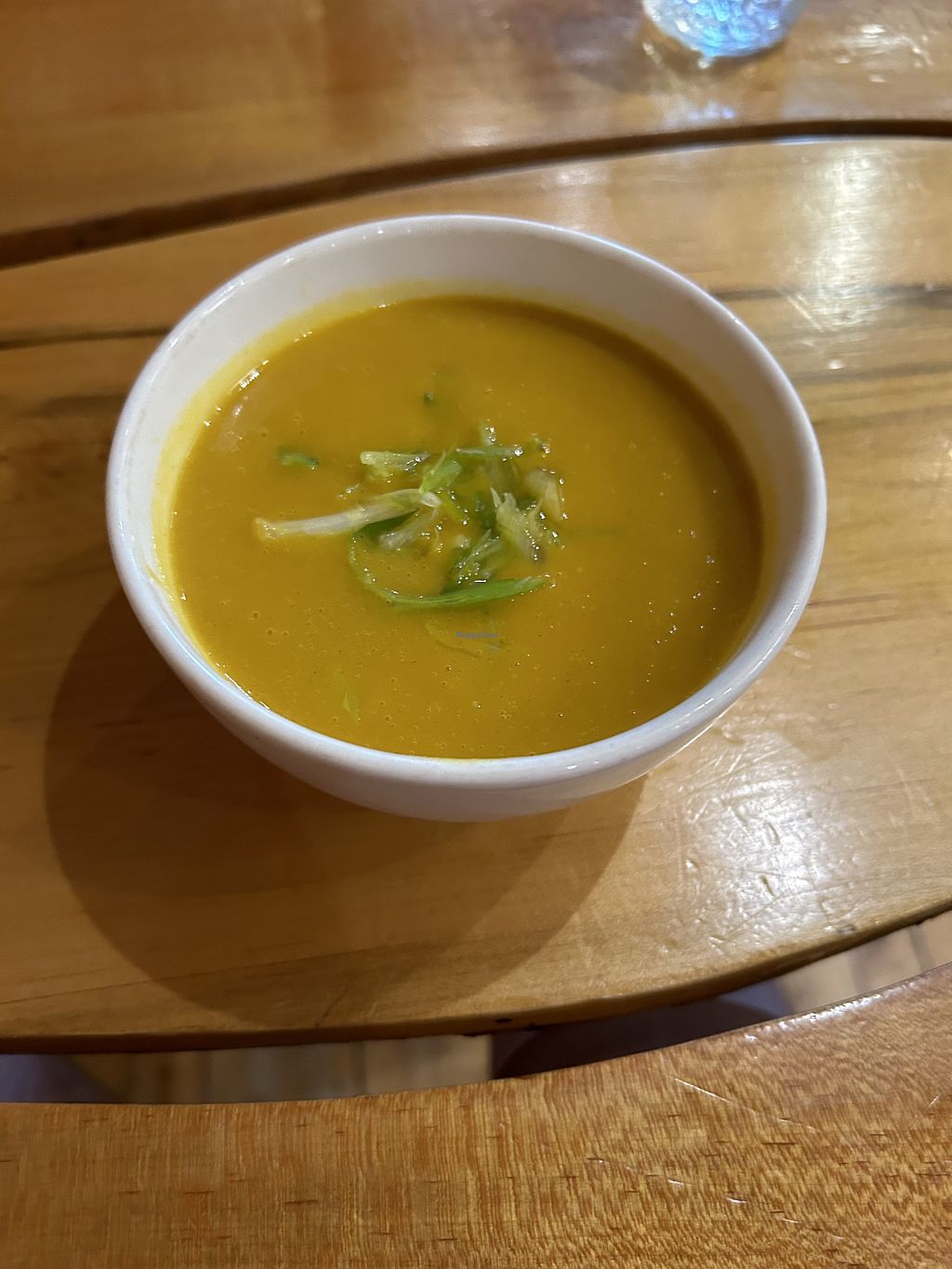 We had a Thai bowl, which was outstanding. A butternut squash soup, which was not my favorite, but still warming. Golden milk and peanut butter smoothie 'Elvis' were both delicious. They made the smoothie sweeter for my kid, who finished the whole thing. Would be good to have one or two sweet options for picky eater kiddos.