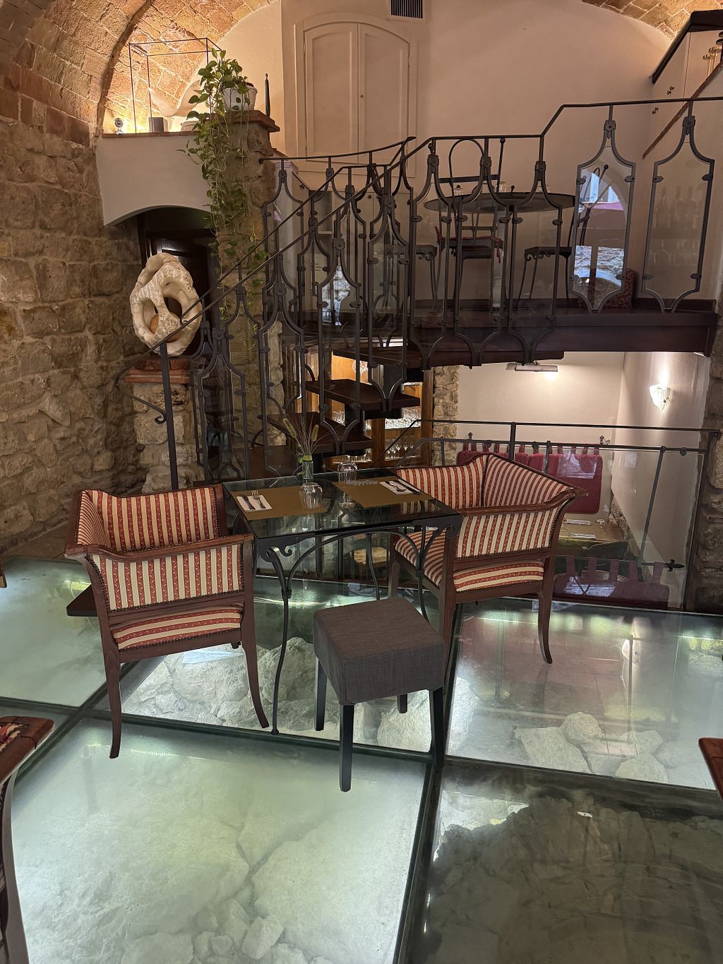 Very friendly owner and staff, food always fantastic, with Etruscan and Roman structures visible under the glass floor. This is our third visit and it is reliably great.