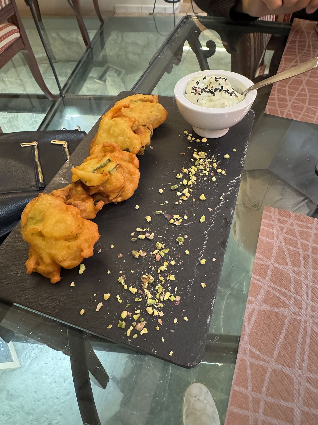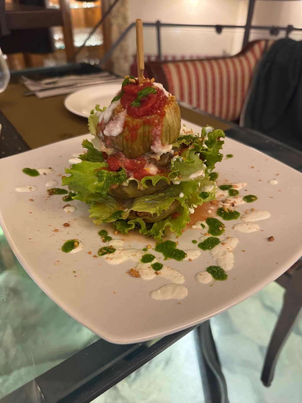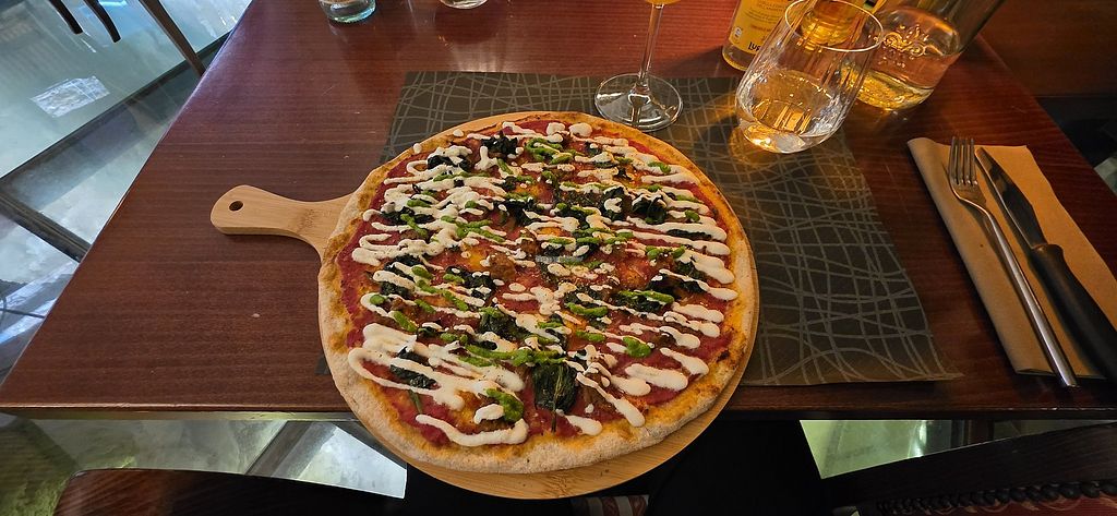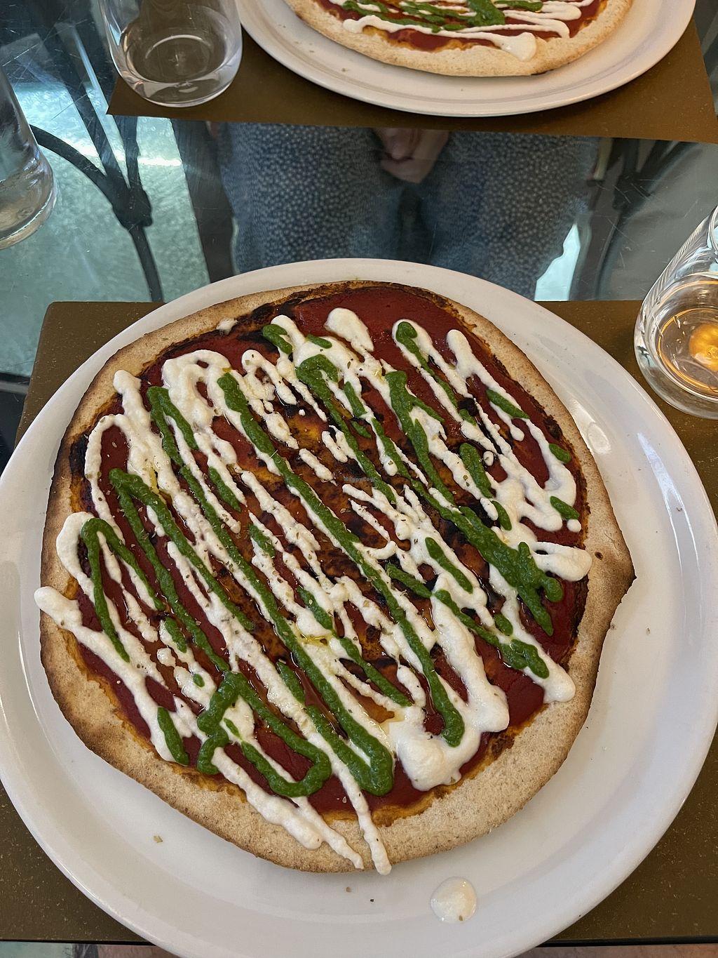 This is a fully plantbased restaurant. We had lunch, with an appetizer with different kinds of hummus and a pizza for main course. Everything was really good and the service was great. Also, the interior is really nice. The floor is see through, where you can see the old roman road. Wow! If you're around, definitely go here!
