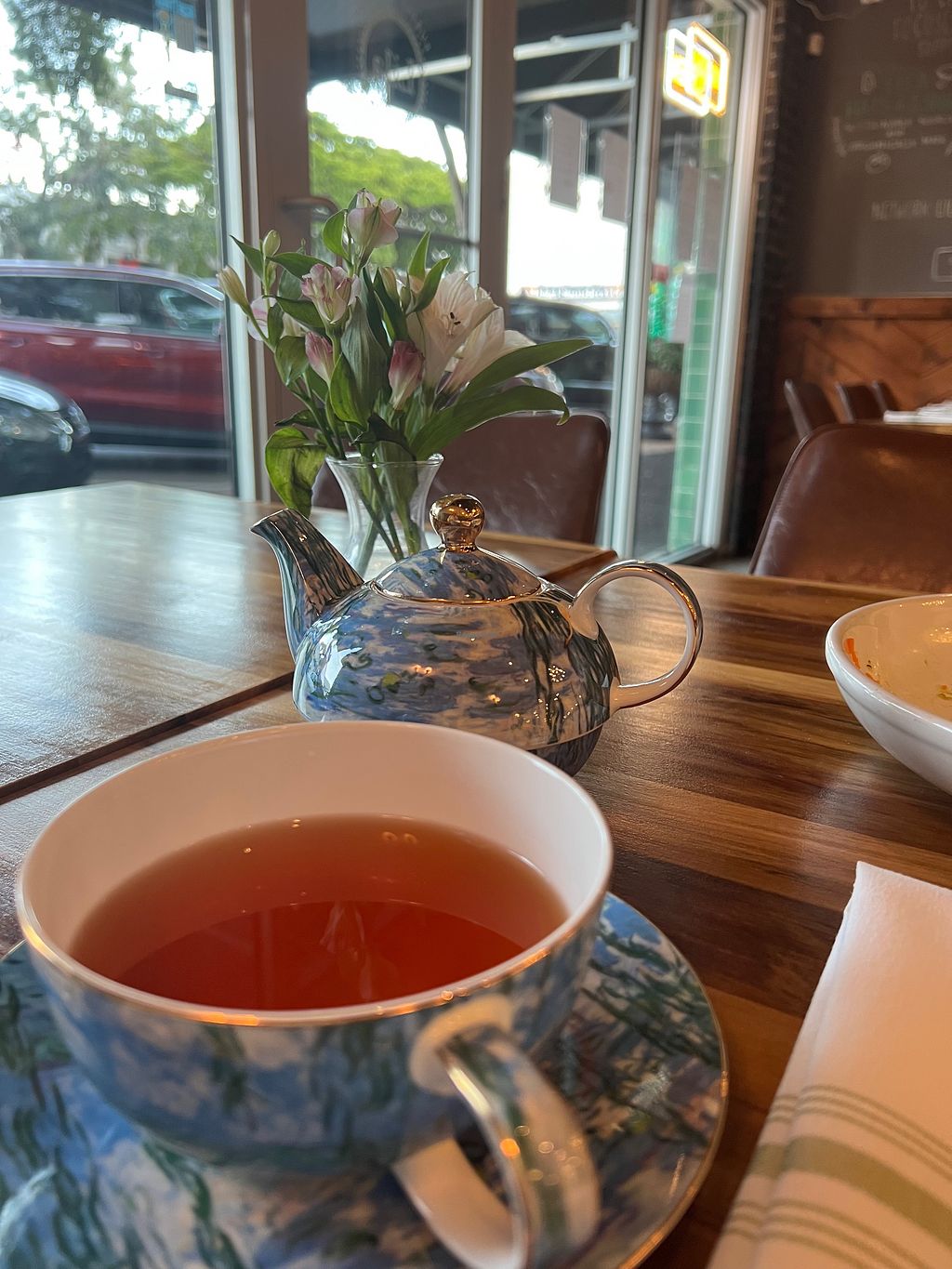Great atmosphere and super service. Place has a hip and modern vibe but cozy and warm. Sweet potato wedges and the shaved Brussels sprout appetizers were delicious. We each had a pot of tea. Burmese noodle bowl was tasty with coconut chili broth. Udon bowl was equally delicious. Chocolate tart and chocolate mousse cake were divine and the perfect end to a perfect and healthy meal. Can’t wait to return.