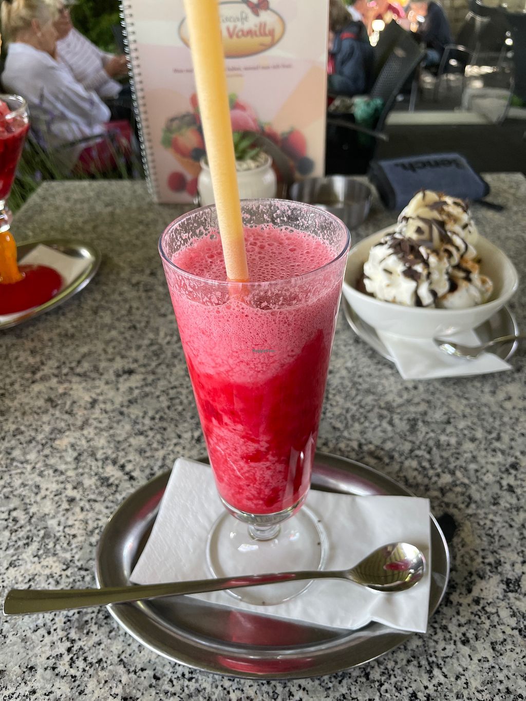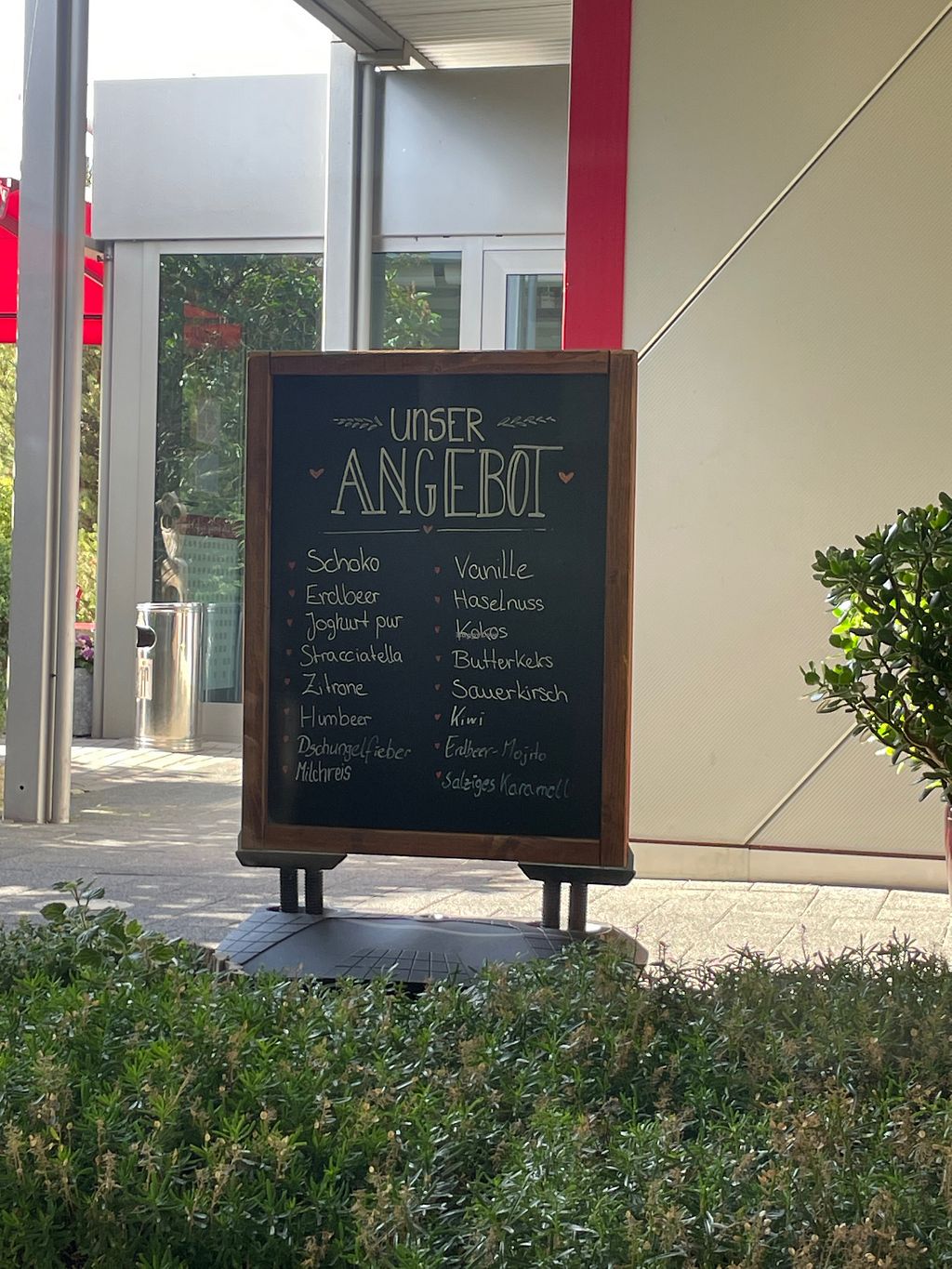 Es gibt super viele vegane Fruchteissorten, allerdings nur Hafermilch als Milchalternative. Es gibt drei verschiedene vegane Waffeln (eine ganz große, und zwei Waffelbecher)