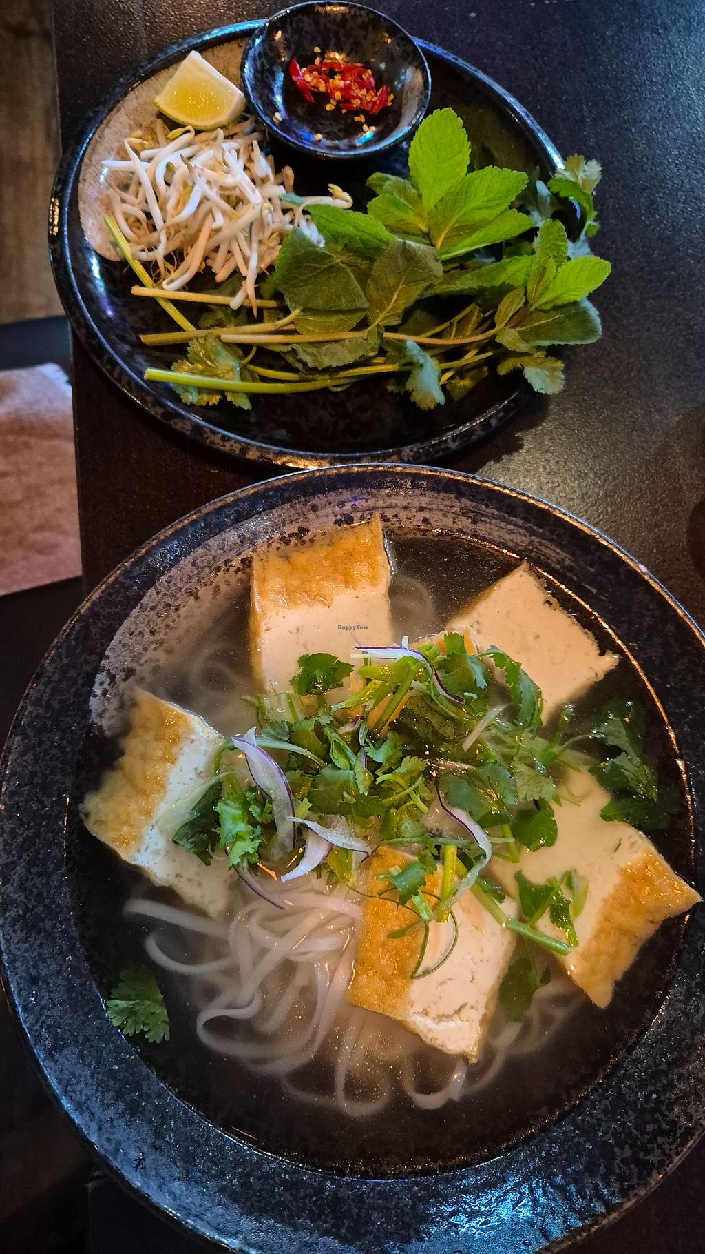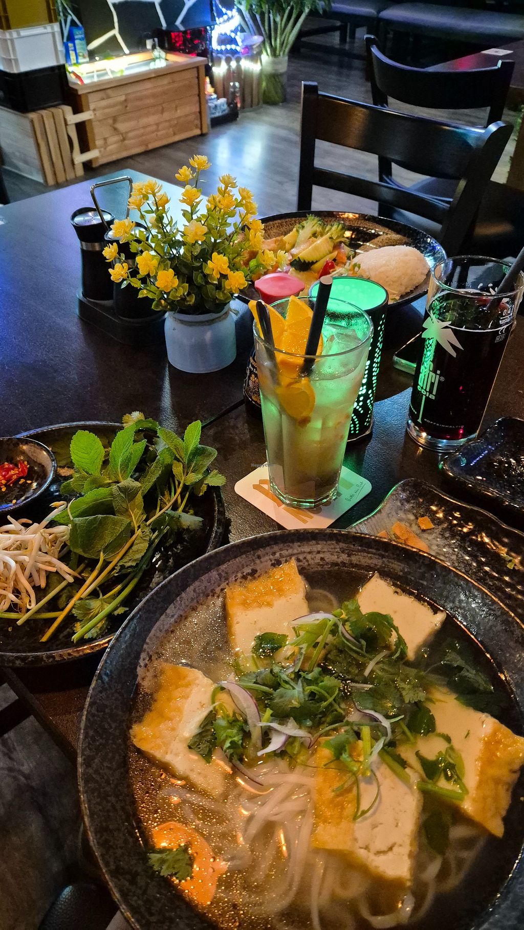 Very friendly & accommodating staff, beautiful interior, quite busy even on weekdays. Menu doesn't list vegan food, but allergenes are clearly labelled on the vegetarian dishes, and staff is knowledgable of the ingredients and veganism as well. The vegan Phở was a bit bland, but very generous with the tofu, the starters (we had summer rolls and gyoza) were amazing.