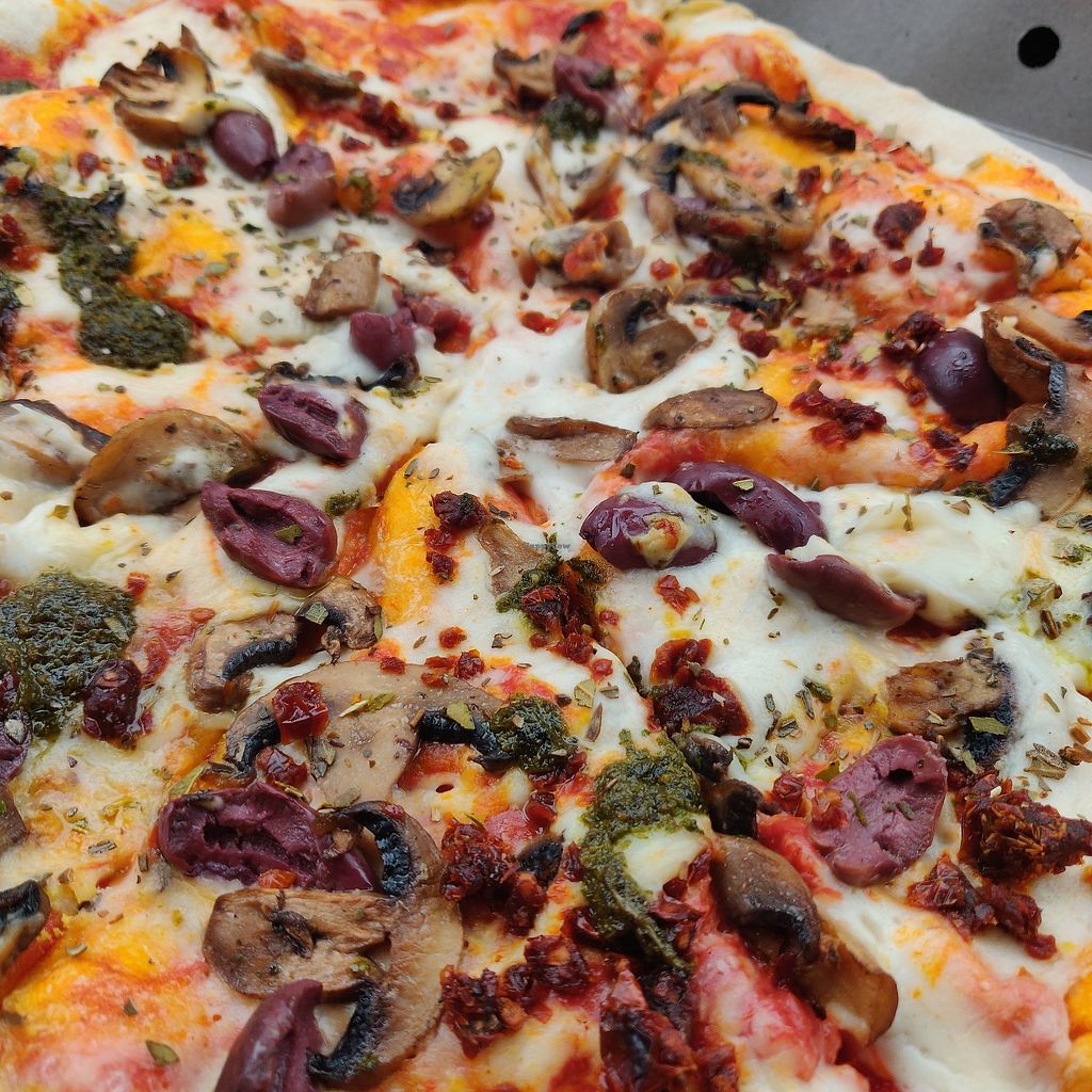 Pizza mit Oliven, getrockneten Tomaten und Champignons