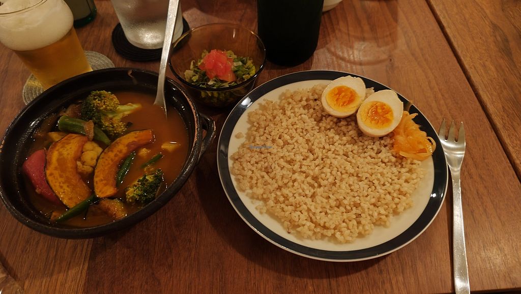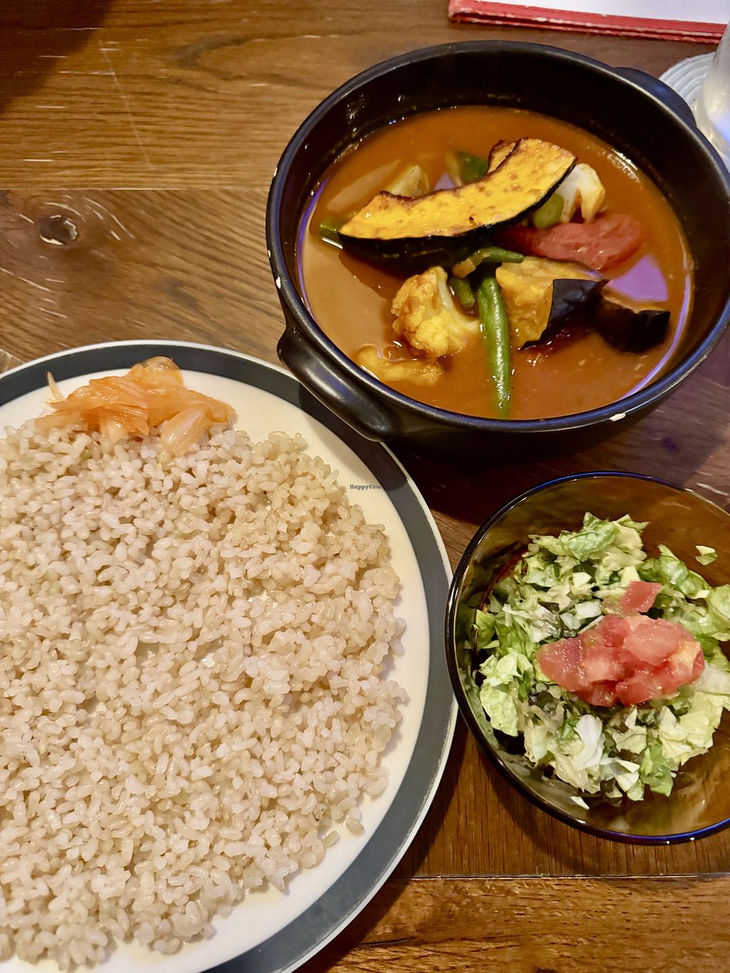 Vegan curry. Really good, not thick like classic Japanese curry. It's possible to choose a spice level. And you can add egg or cheese if you want.