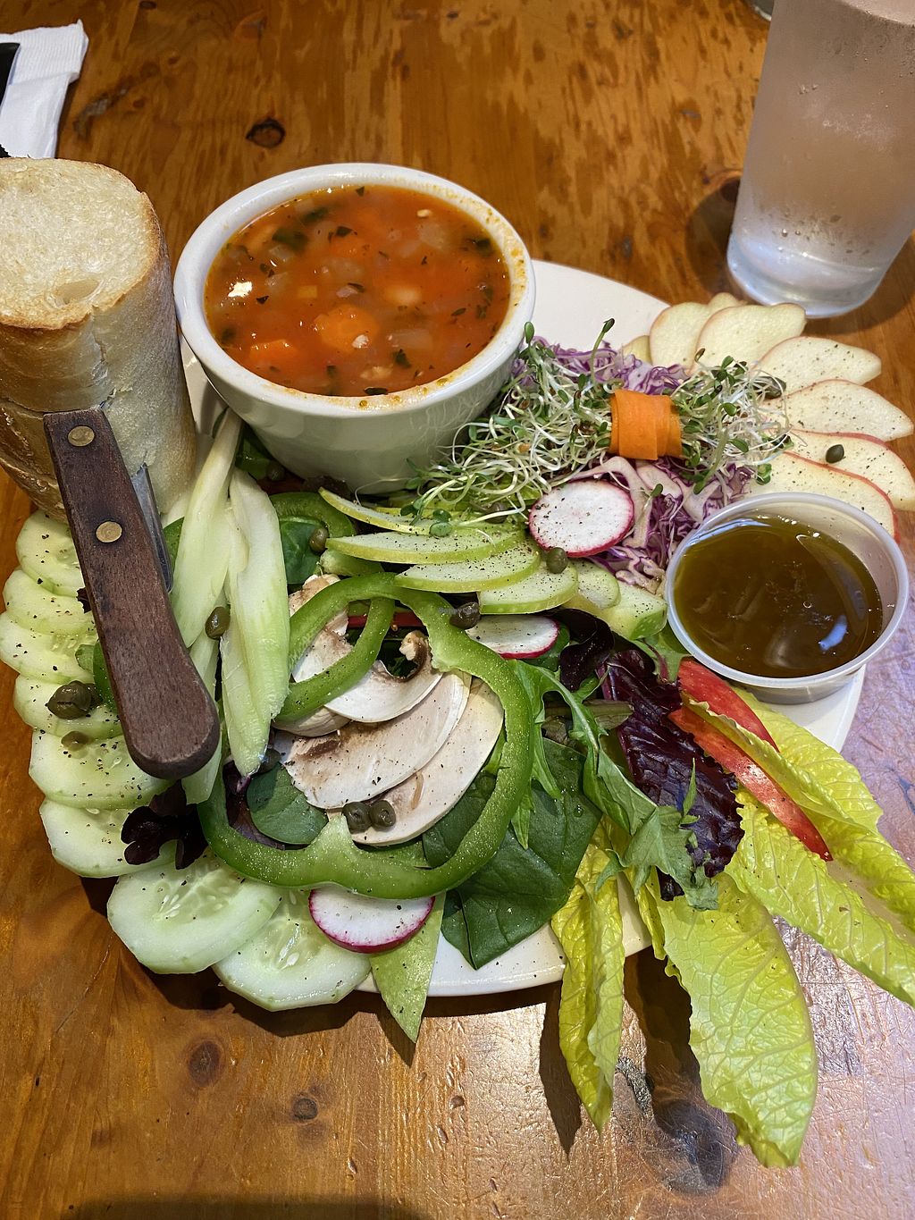 Lots of vegan options! Loved the cauliflower soup and mushroom/avocado sandwich. Unfortunately for my husband, no gluten-free bread, which is too bad for all those great sandwiches! Rob got the raw-foods taco (wrapped in lettuce) which he liked.
