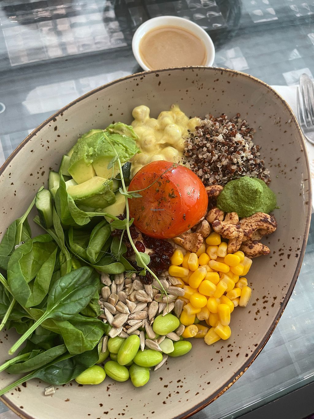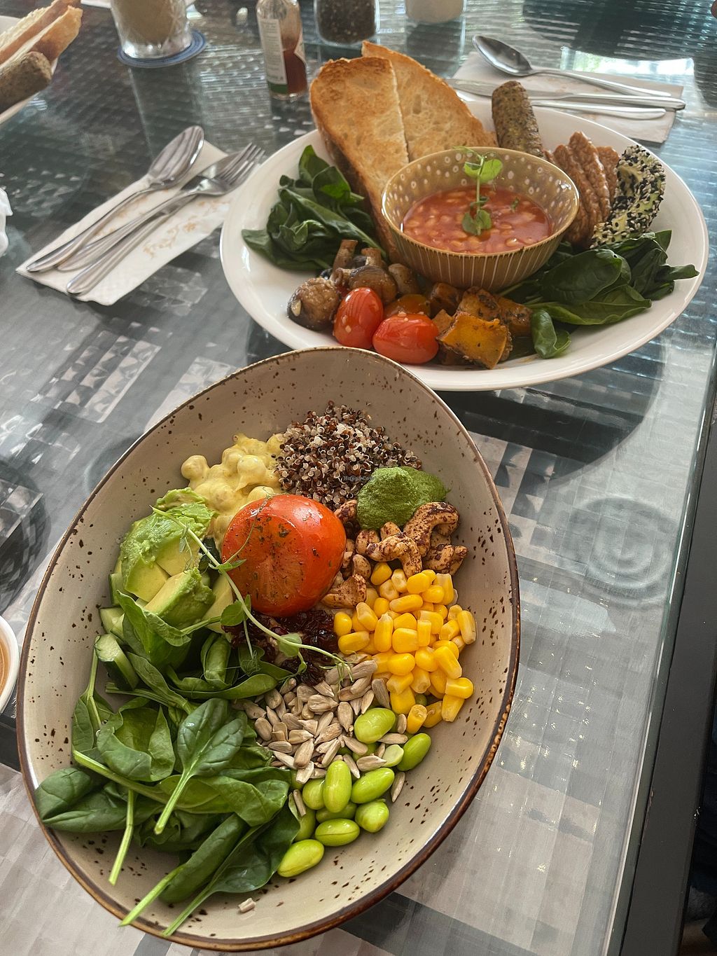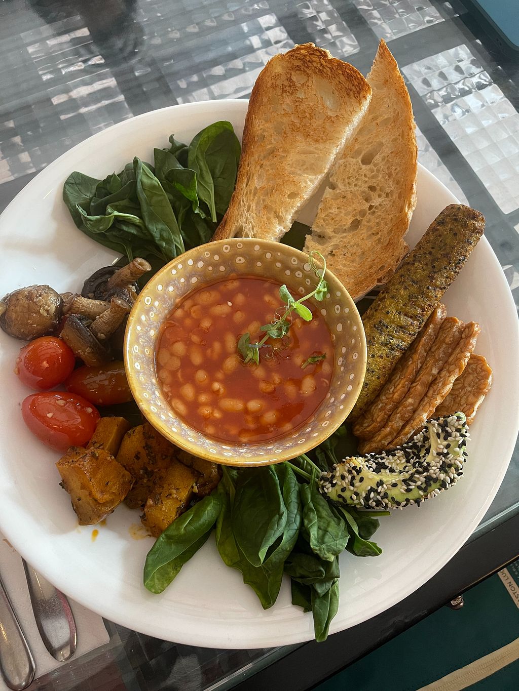 Serves meat, vegan options available. A restaurant/bakery with a variety of vegan dishes. Includes a big breakfast, pasta with vegan meat. a burger, vegan Bolognese, power bowl salad, vegetable samosas, and more. Also has a vegan chocolate dessert. Open Mon-Sun 8:00am-10:00pm.