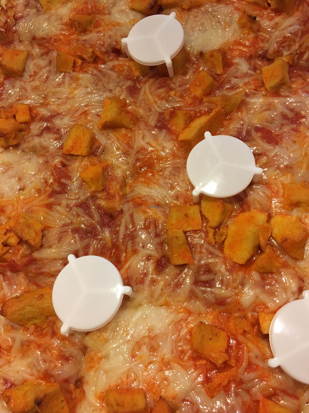 Pizza with vegan cheese and vegan buffalo chicken.