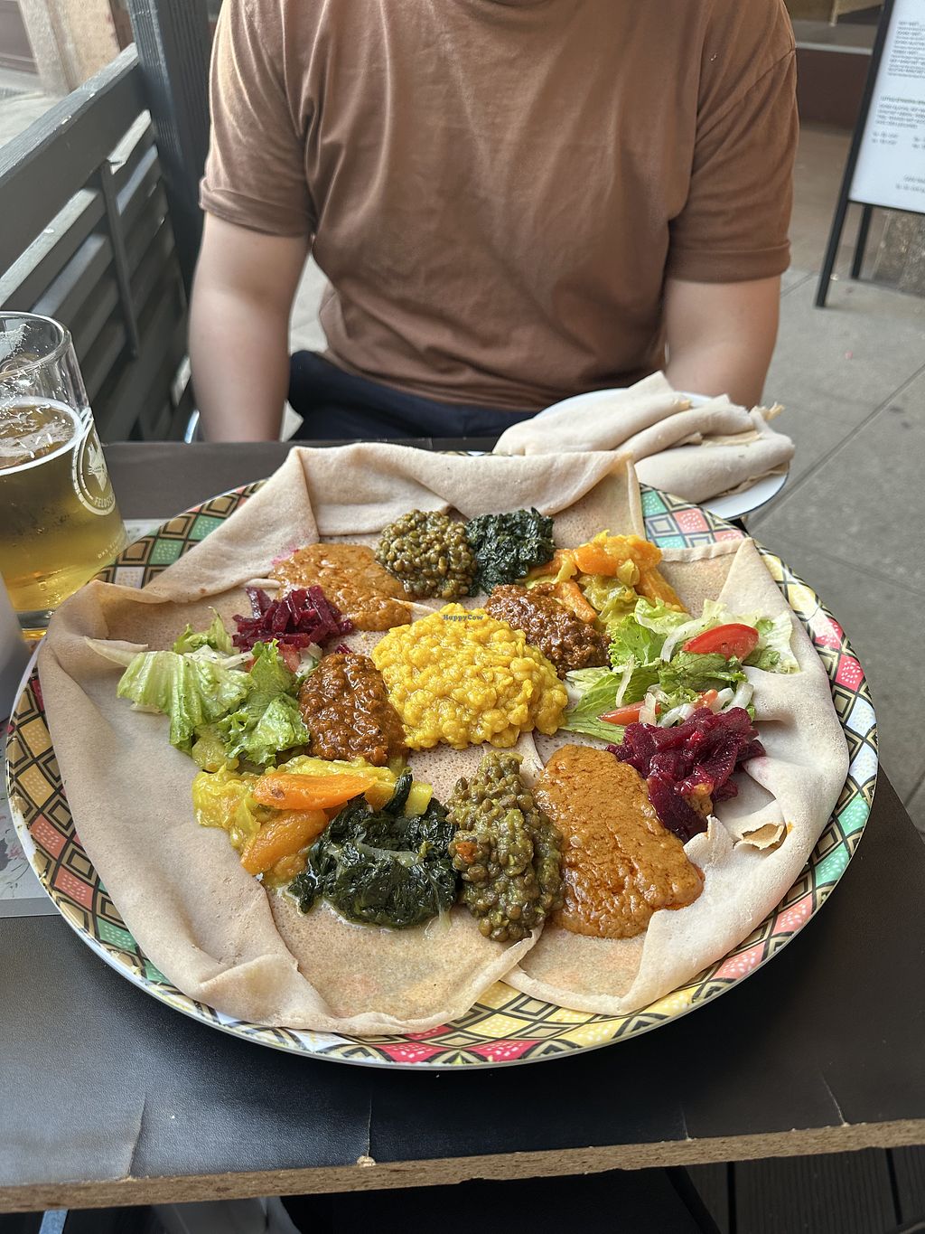 absolutely wonderful ethiopian restaurant w/ a section on the menu of vegan options. paid about €30 but i think that’s good for the place & amount of food. service was outstanding of course. ❤️❤️❤️