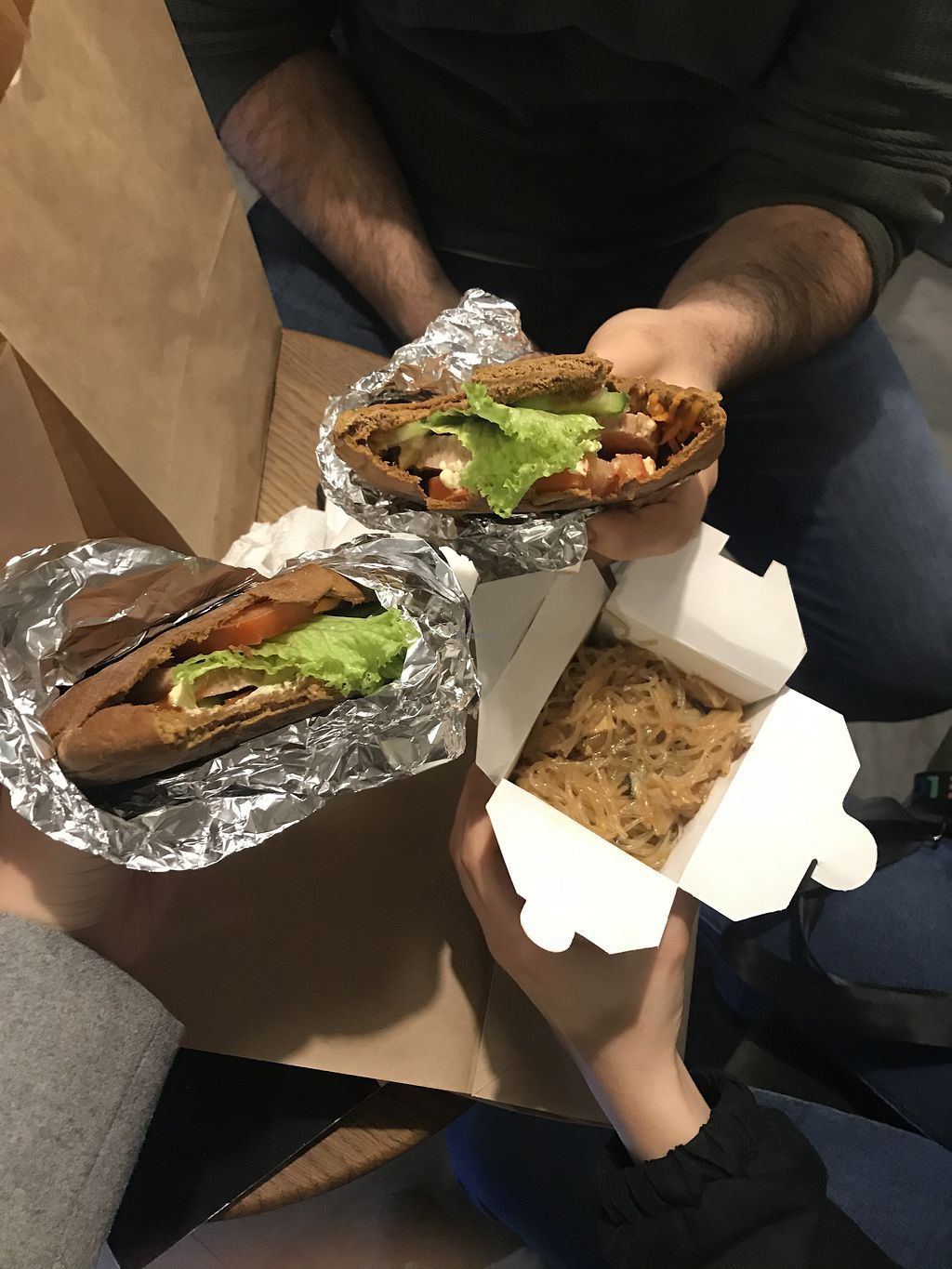 4 types of pita - falafel - smoked tofu - seitan (wheat sausage) - fet…