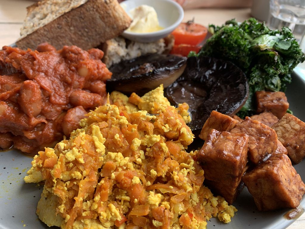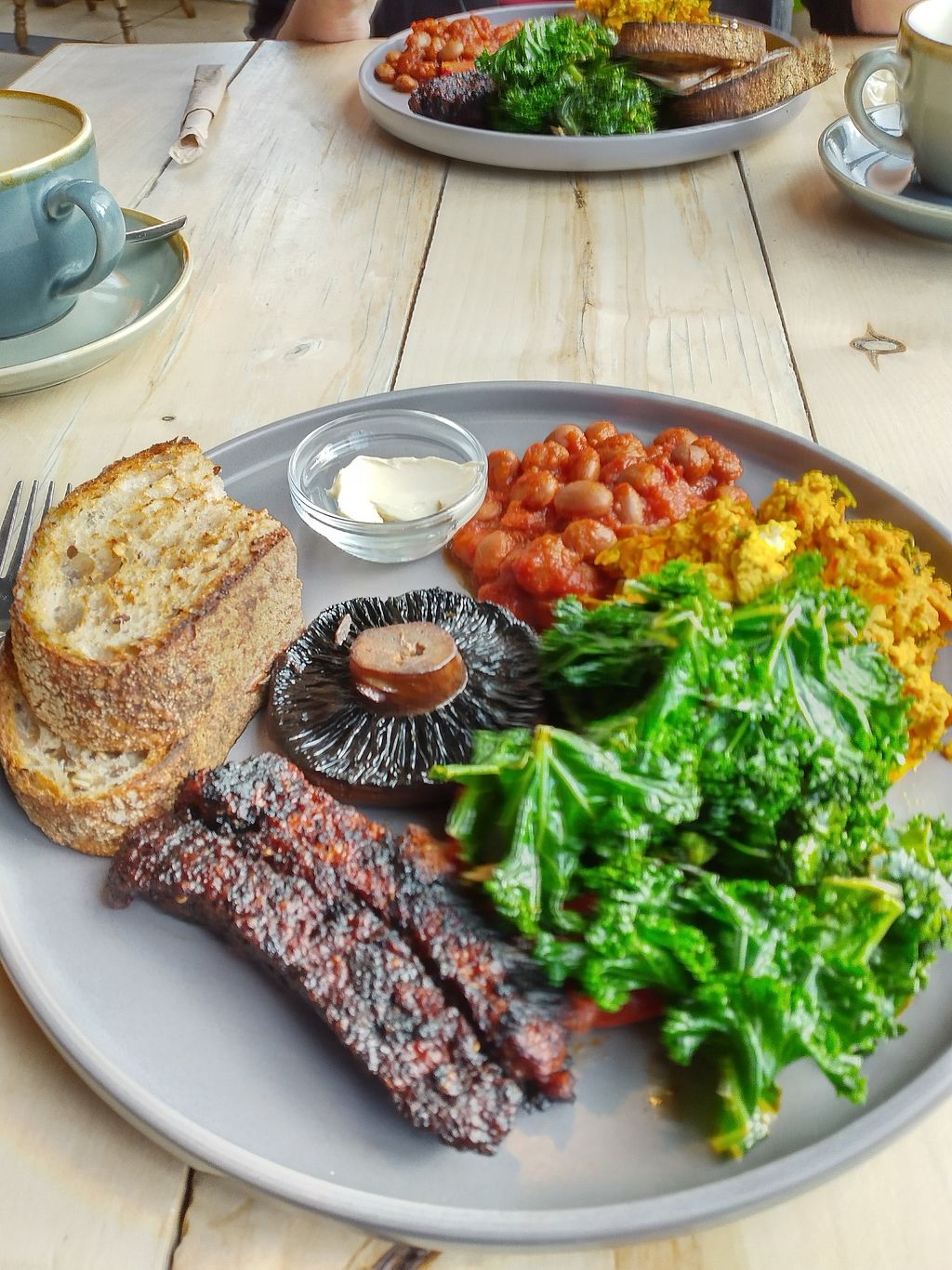 Full vegan breakfast, delicious tempeh sausage