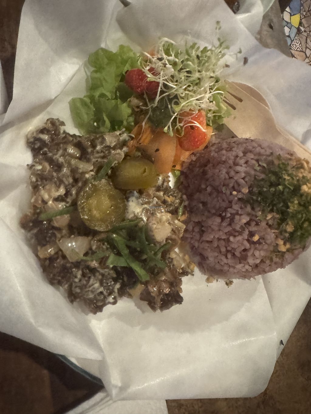 So good, I almost cried. Offering traditional foods as well as tofu burgers, this place is in a wonderful area. Surrounded by green and on the bottom floor of the “Art Watering Hole”, the vibe of this place is everything. It’s honestly my favorite place in the entire city. The utensils and serving dish are compostable and they make kombucha!