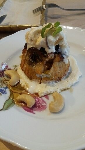 a delectable banana muffin with soy whipped cream & a kind of coffee-m…