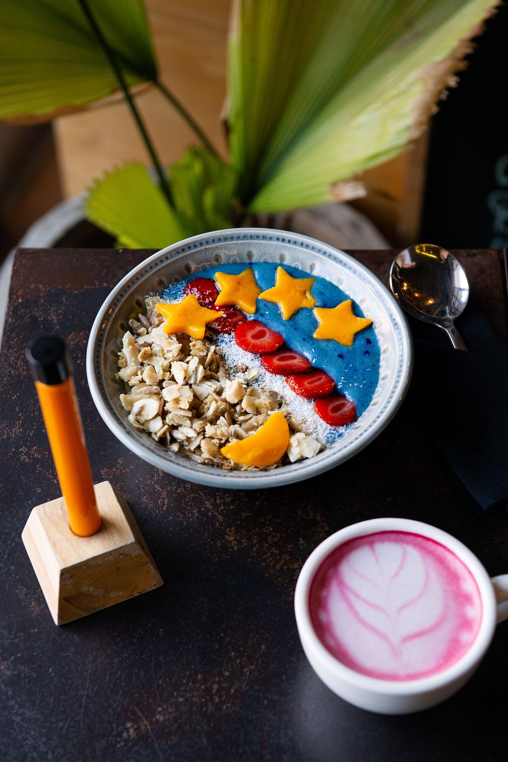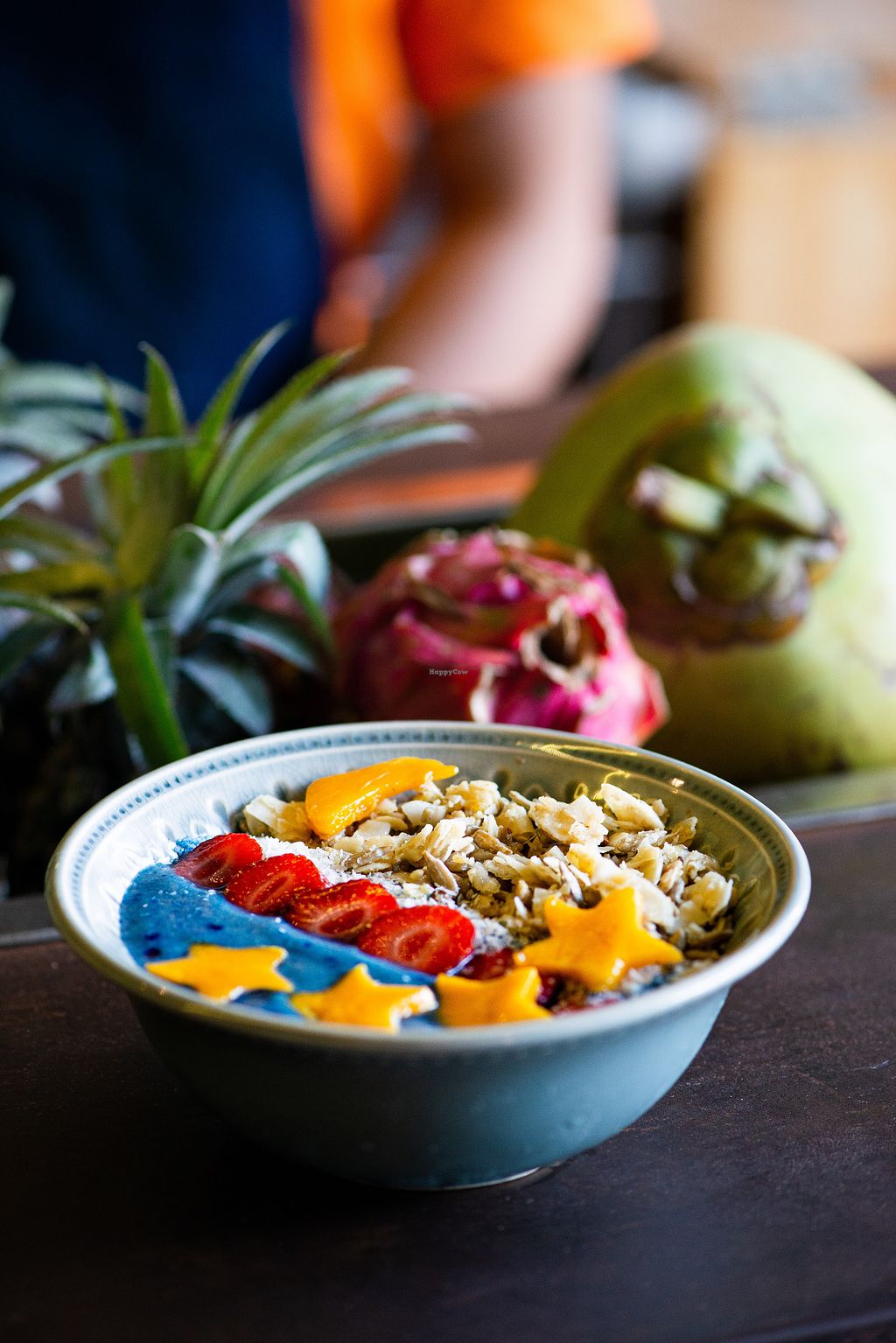 Blue ocean smoothie bowl, topped with homemade rawnola and served with…