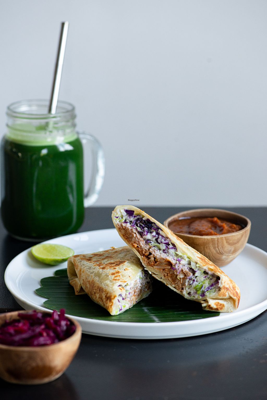 Barbecue jackfruit wrap, served with extra sauce and sauerkraut.