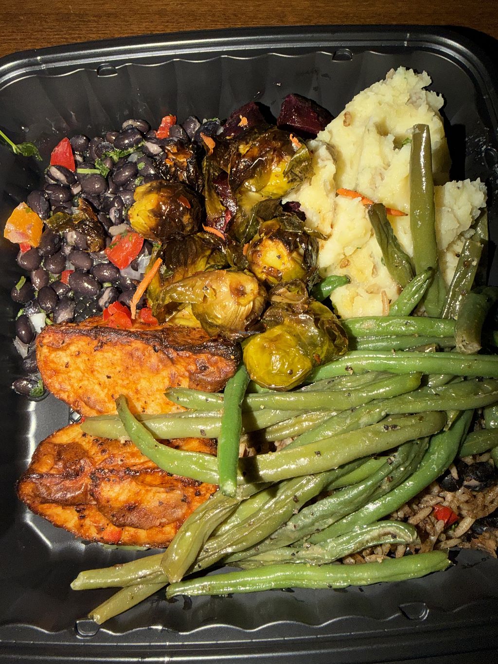 The place has a great vibe — part market, part café, with a laid‑back, eclectic atmosphere. At the counter, we chose from a variety of tempting dishes, including grilled portobello mushrooms, mashed potatoes, roasted beets, fresh green beans, Brussels sprouts, and several kinds of bean salads. Prices run about $15 per pound.