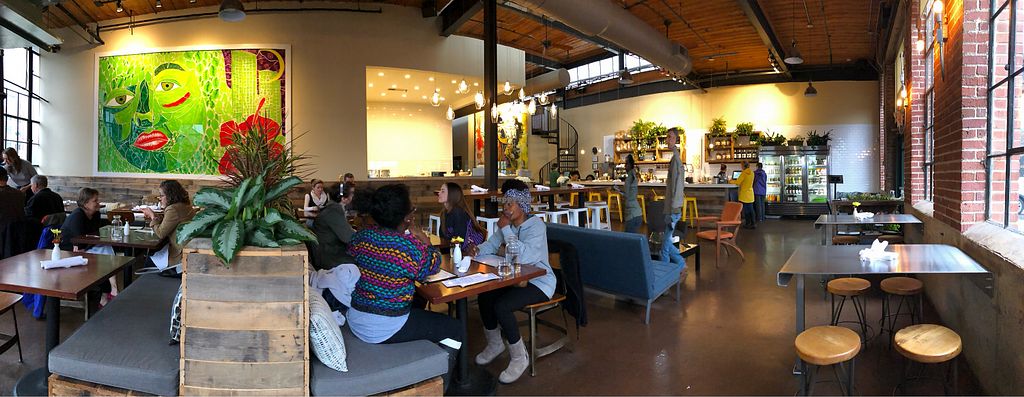 This restaurant is mostly (maybe totally) vegan. Stopped in for something quick (to go) and they had some great options. Hope to be able to sit down for a meal here. Very beautiful space.
