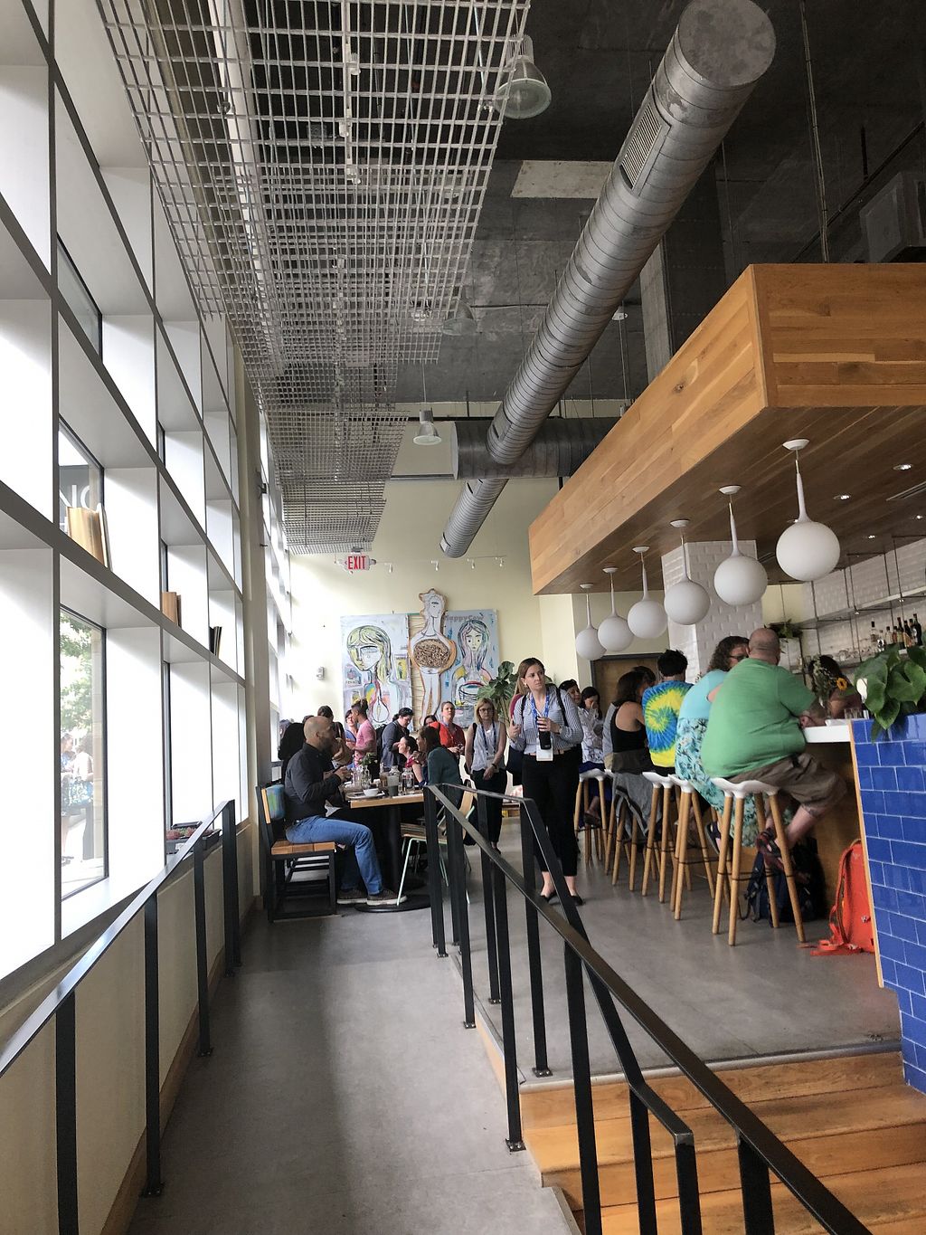 Went entedin when first opened for the day and when we left line was forming out the door. Clean fresh small plates. Well let’s and really good. Had tamale special and a gluten free waffle that I was skeptical to order but delicious. Had bbq mush sandwich, arugula salad, kale Caesar and pizza. All well done and well presented. Smaller portions are great for trying multiple things and all in my group were happy and felt great when we left!