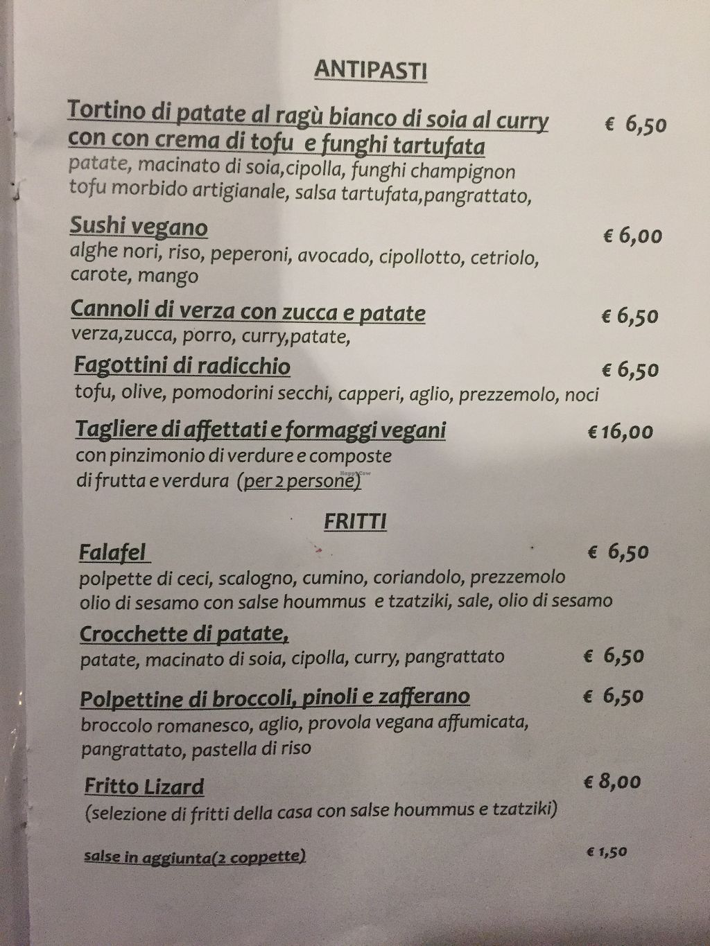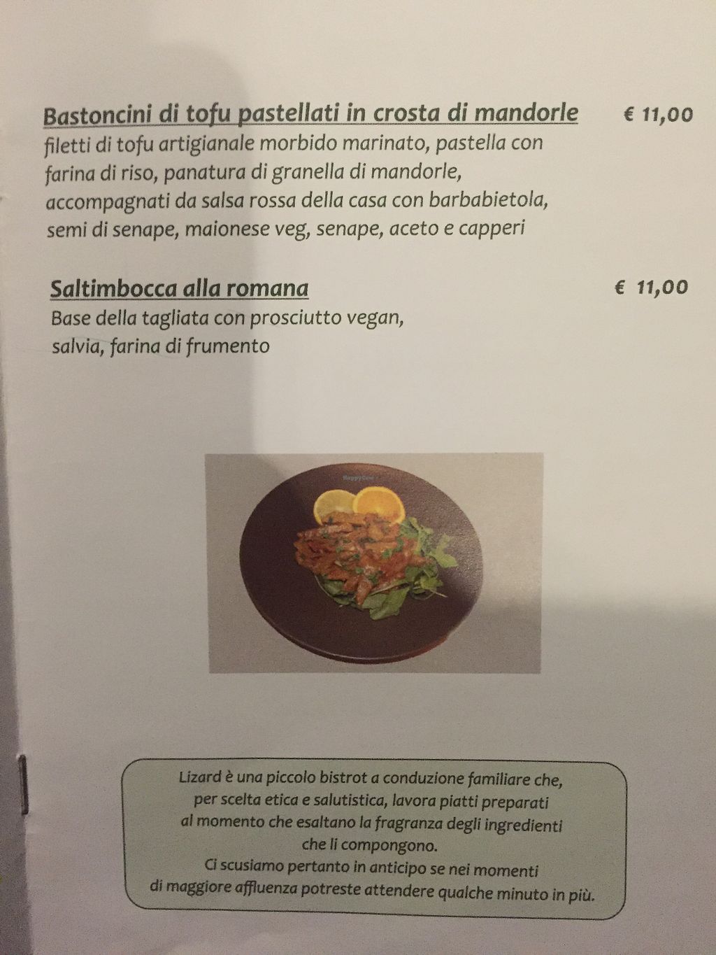 Lizard Bistrot is an authentic biological vegan family business!! They are very friendly conscious natural humans!! It is a small place in the winter with space for 16 guests, but in the summer they open the terrace. They have an English and an Italian menu to present their ecological dishes. All their dishes are completely vegan but they offer also vegan sushi, veg cheese and veggie salami with vegetables in their appetizer menu! When I arrived they were fully booked but they prepared me an amazing menu for take away!! They served cannoli of savoy cabbage as a starter. The main dish was chili soy with red beans and tacos. As dessert they packaged me vegan chocolate cake!! On their walls they have beautiful lizard art and the walls are painted with a yellow texture. The ceiling is decorated with bambus and for the hot summers they have an air condition. Thanks so much for supporting our animal friends on their path to liberation!! I will recommend this place for sure!! See you again soon!