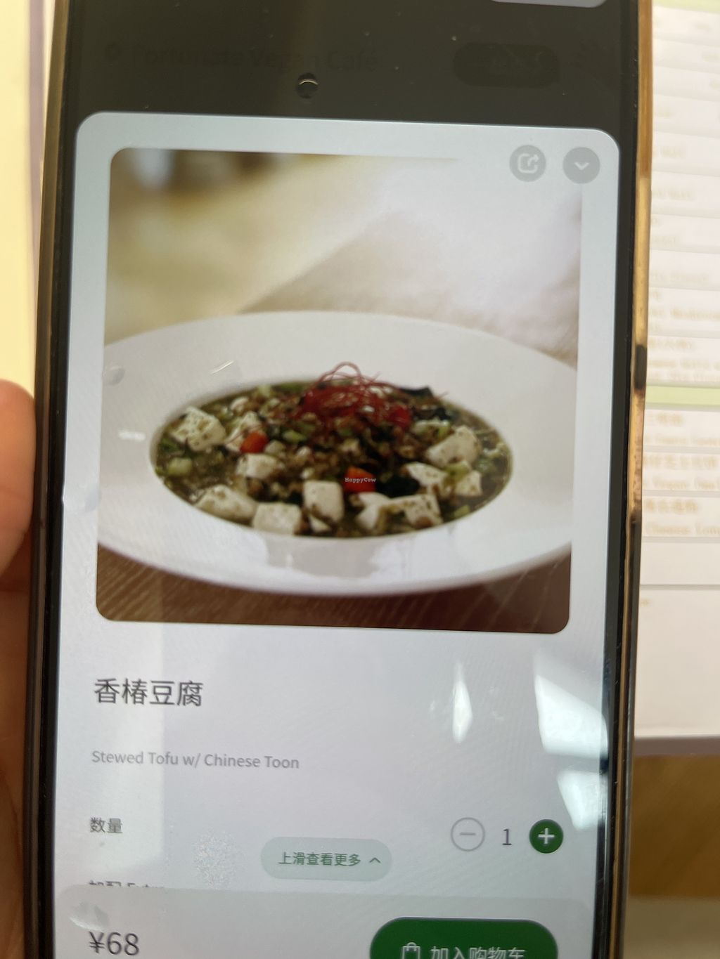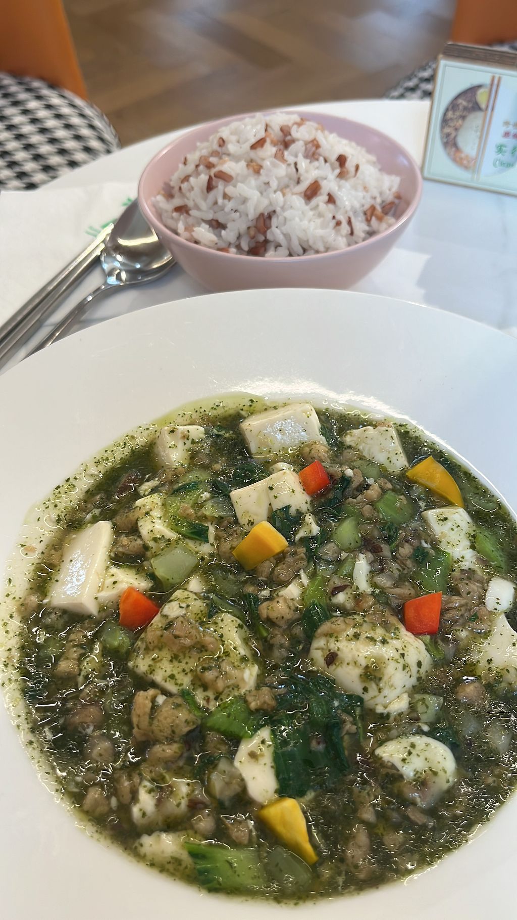 Plenty of vegan options: tofu, tempeh, vegan egg… I had the Stewed tofu with Chinese toon, rica and a matcha oat milk and it was delicious. The atmosphere is very nice! A lot of natural light, spacious and the waiters are super kind 👌🏼 Everything 115 yuan