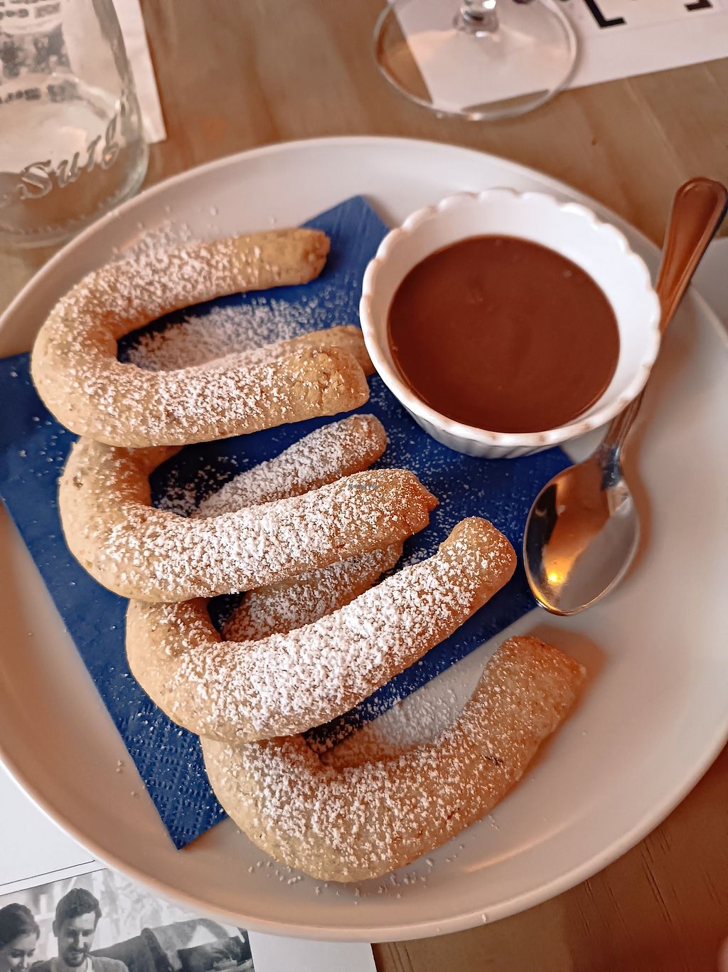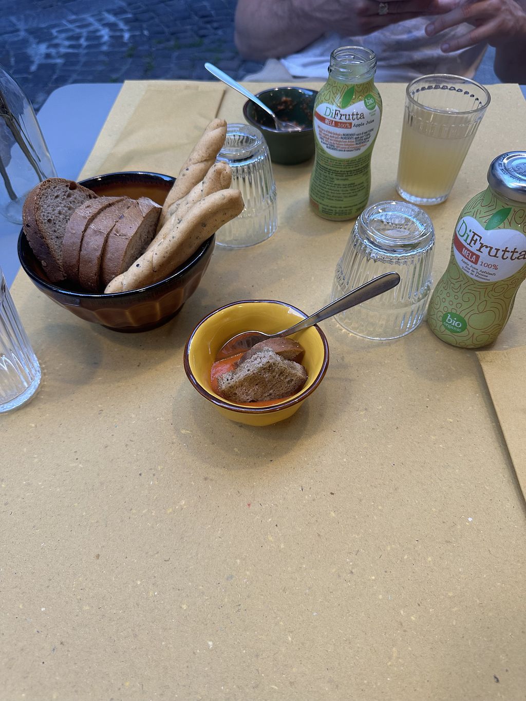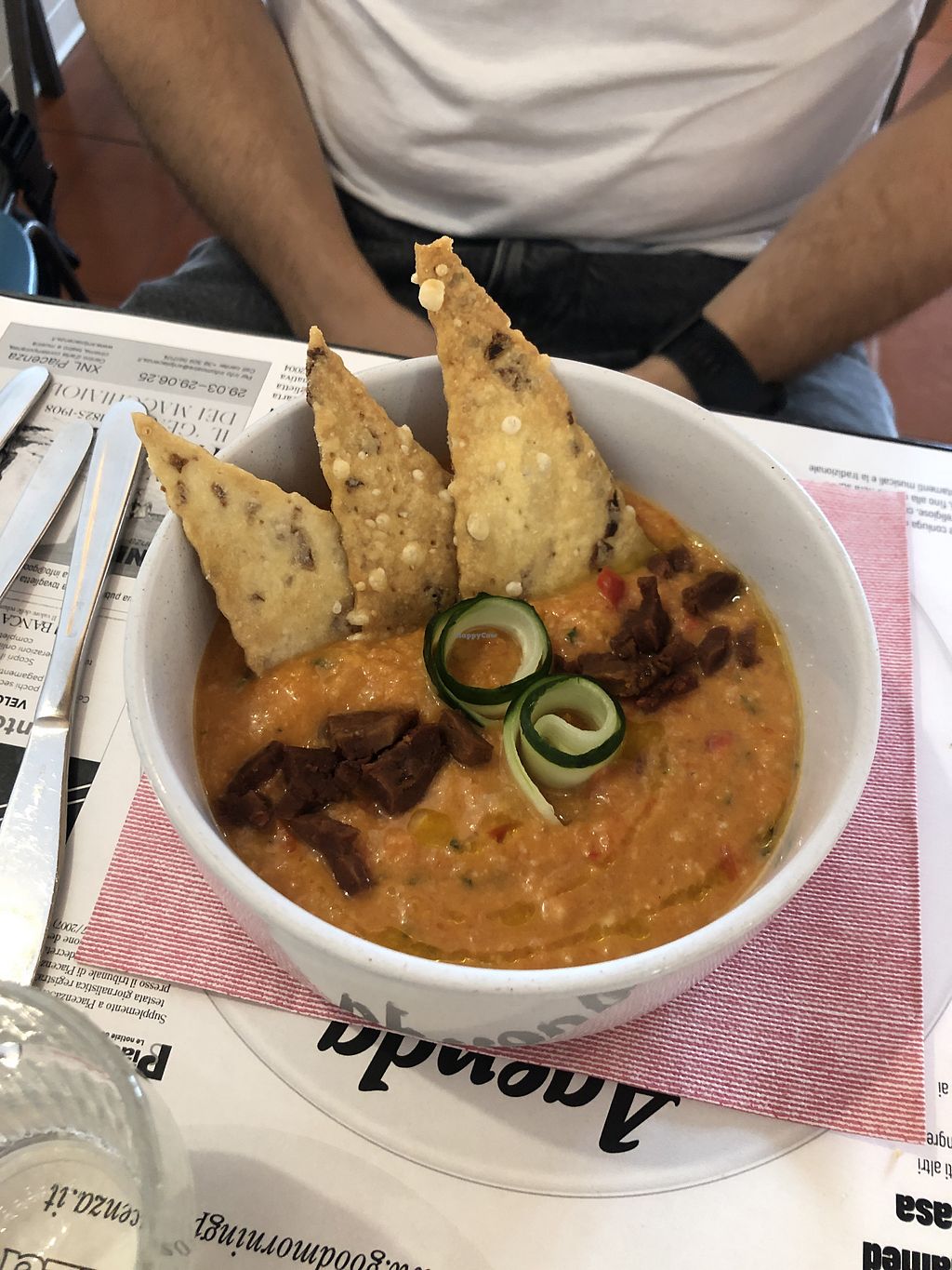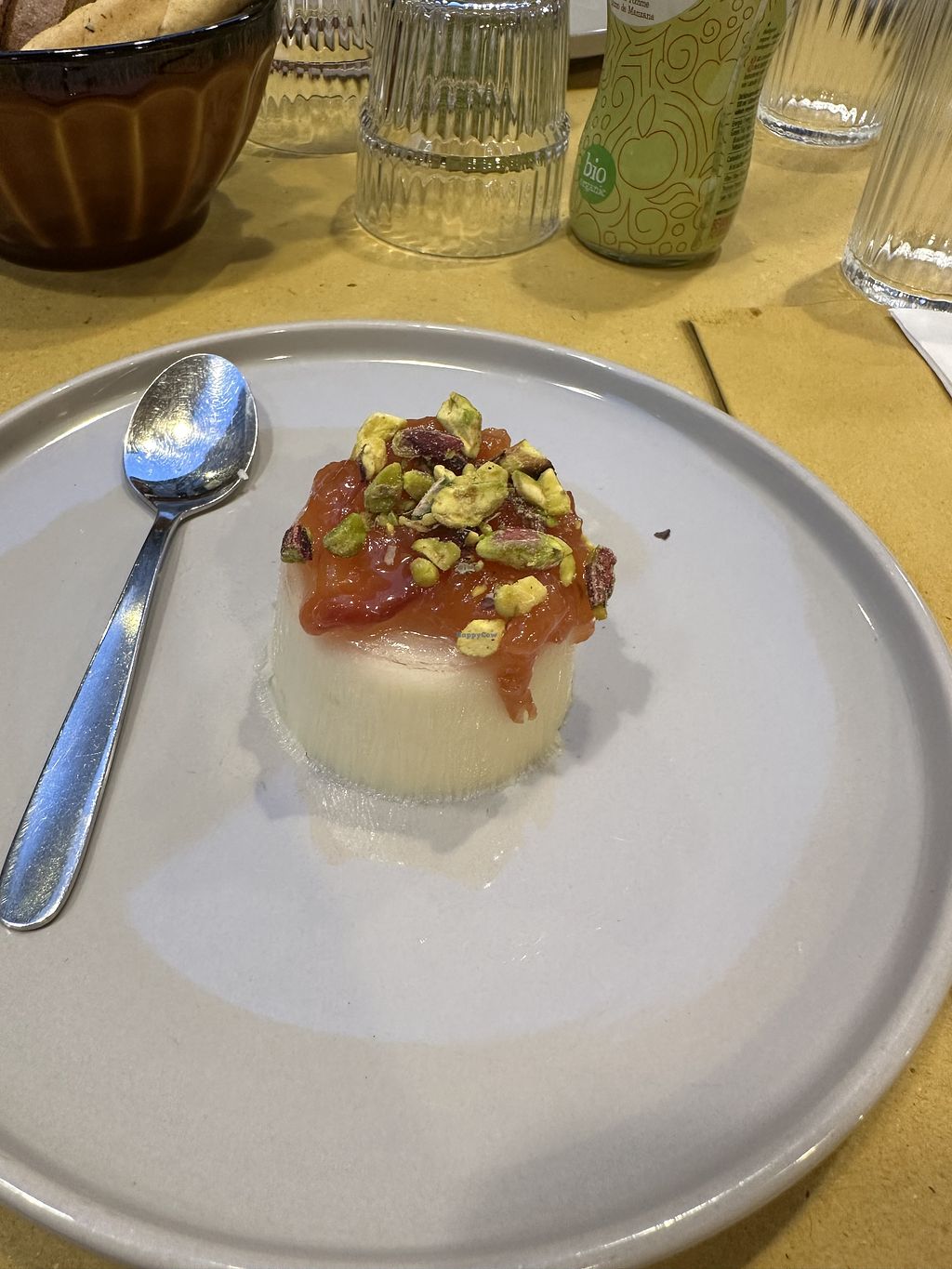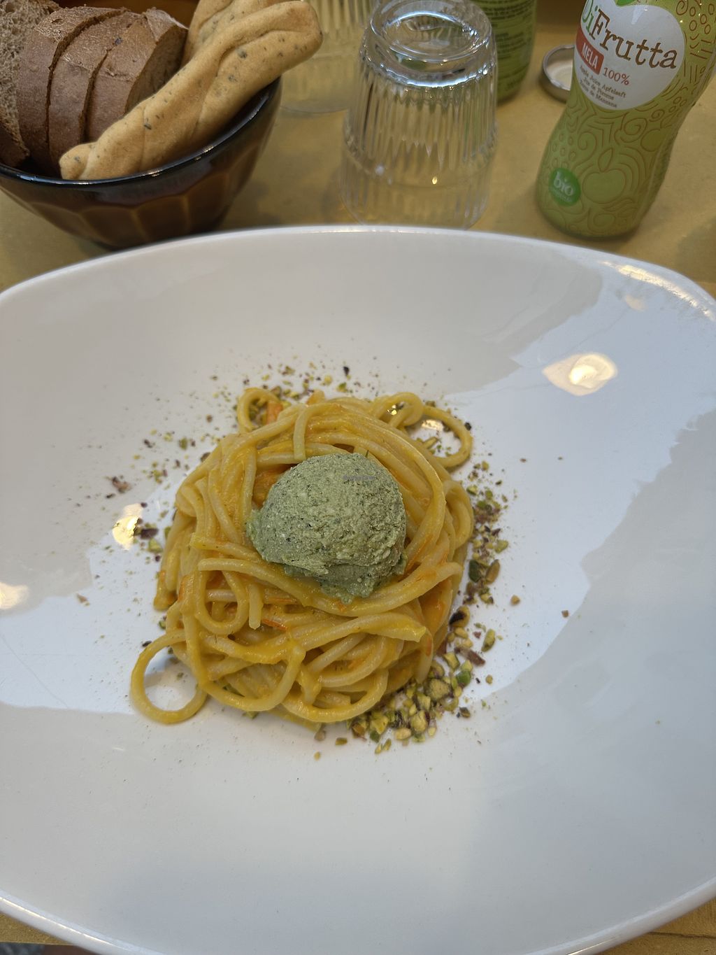 Menu at lunch includes around 6 dishes, we had a very refreshing gazpacho (~10€) and a mixed plate with half a portion of whole grain spaghetti with a housemade basil pesto and potato cream, as well as half of a “kebab” roll, which reminded me more of a veggie-wrap, but nevertheless very delicious.
