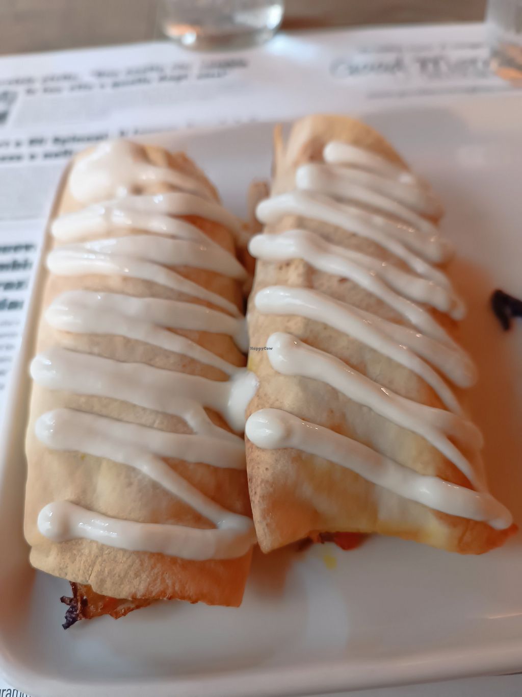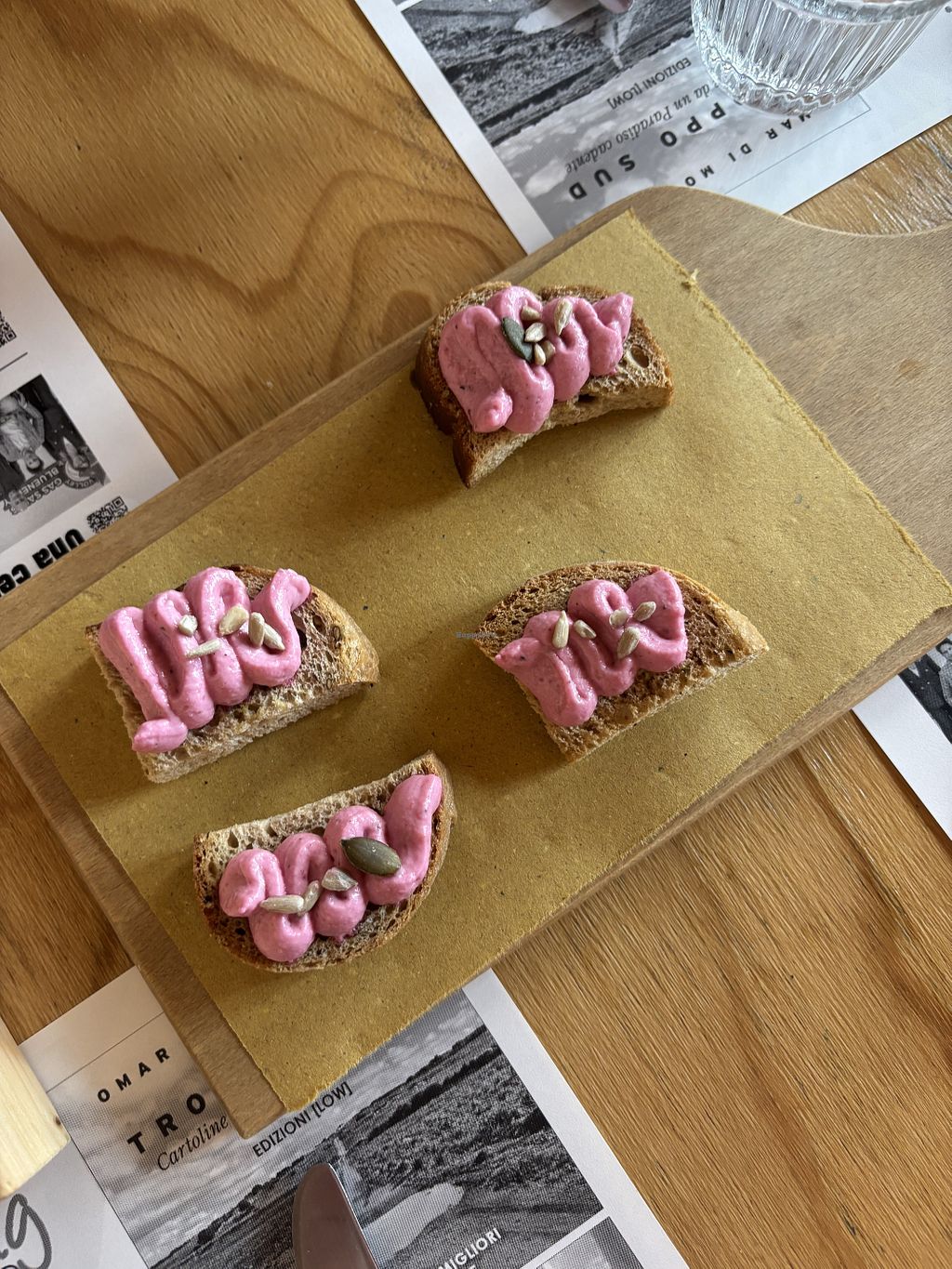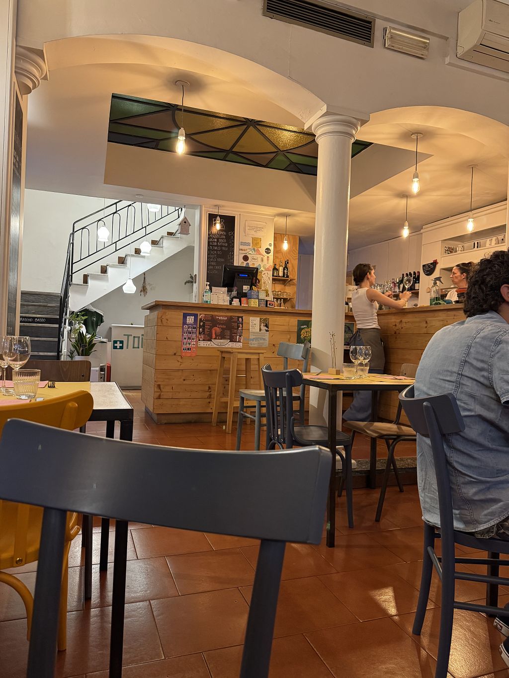 In a very cozy and welcoming space, "arty" without being pretentious, you can find a very surprising meal to share with friends. Everybody can enjoy it, not only who's 100% veg. And that's a plus. I had a peach risotto, interesting, but the real surprise was veg Cevapici, spiced sausages "Jugoslavian style". And well, it was a vegetable one, not seitan nor some meat-like-wannabe artificial product. And they were just azing.