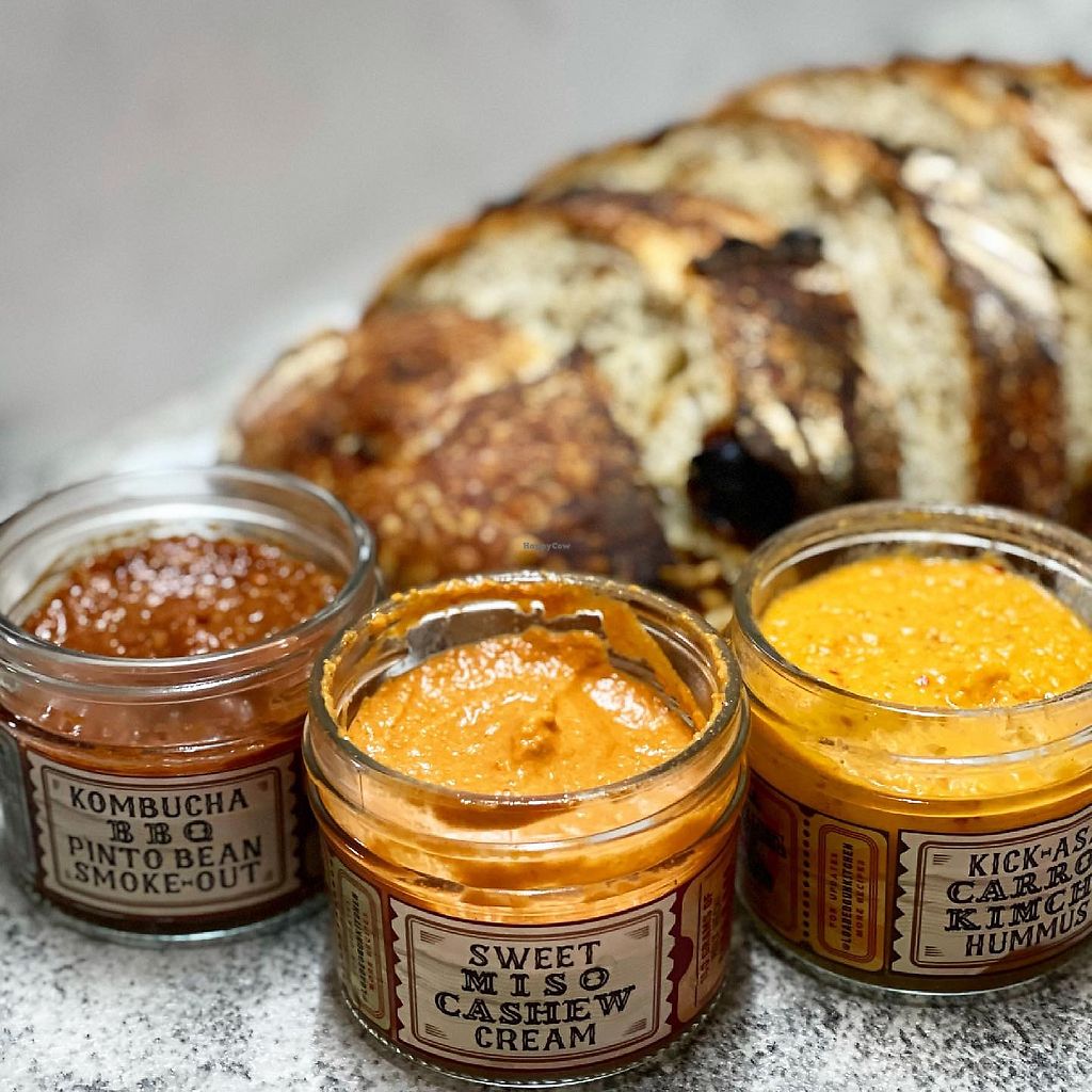 Read moreI had a big loaf of bread (require cutting) and three plant based cream- “Kombucha BBQ Pinto Bean Smoke Out”, “Sweet Miso Cashew Cream”, & “Kick Ass Carrot Kimchi Hummus”. Love the cashew cream most among three! Thick, cashewy and creamy 😋 yummy, g8 pairing w sliced bread~ Cream can keep up to 12 days in fridge and bread can be kept up to 6 months if frozen.