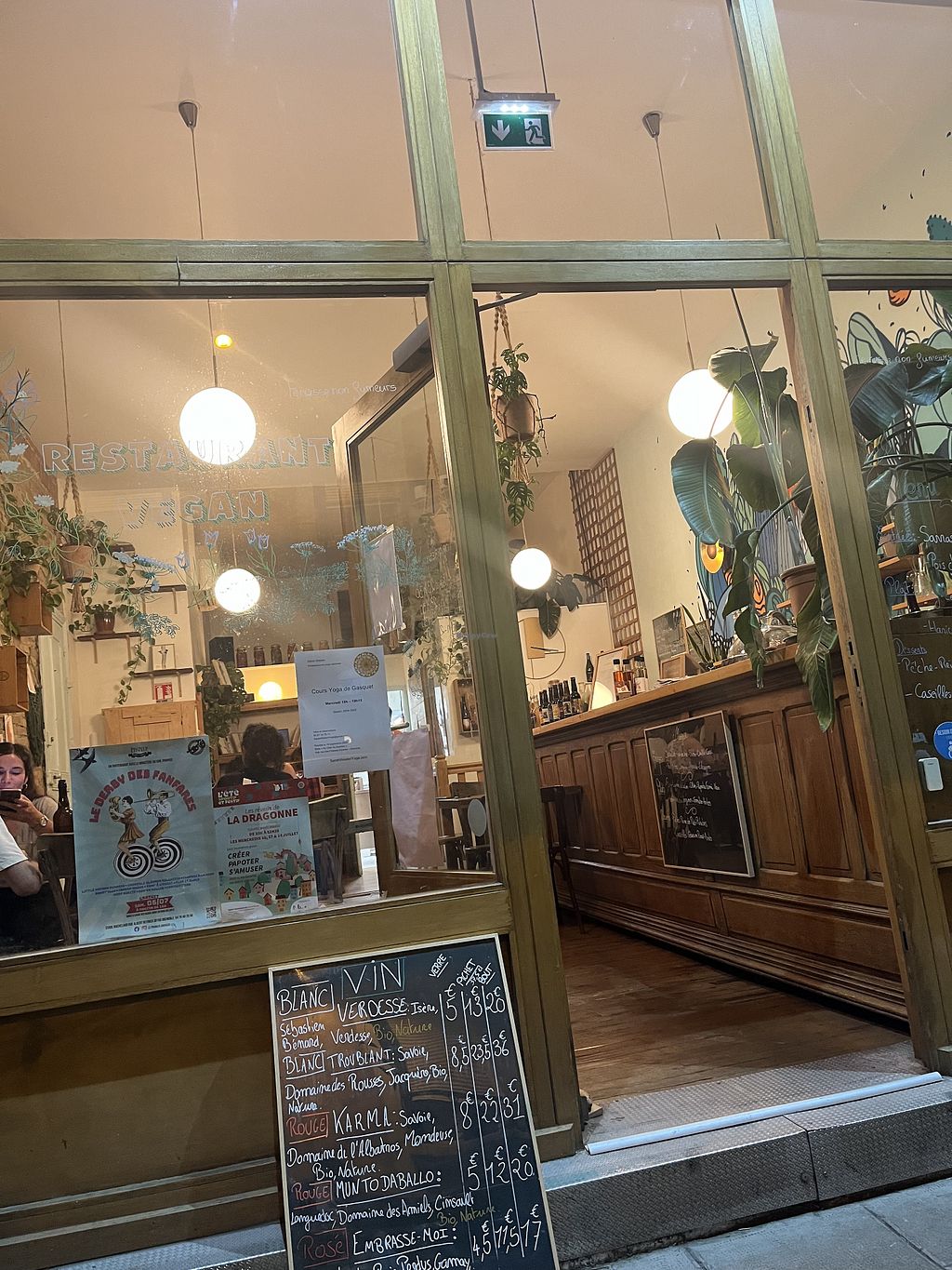 This place is the best vegetarian meal we have had in France. (I know the restaurant is vegan but still applies). We were only planning on drinking a coffee in the afternoon as a friend recommended their coffees, but after seeing their Instagram, we NEEDED to try it out. We had to come back to eat the week after because it was already fully booked. The association of textures and flavors was amazing. Some spices we had never heard of (xawaash was an amazing discovery). We also noticed EVERYTHING was organic, seriously, not a single item on their counters ( or on what you can see in the open kitchen) was missing the organic label. They seem to be very transparent about the origin of their products as they list them all on their website (and also their bathroom lol). This is the first time I've seen such a level of openness about a restaurants suppliers, hope it catches on! The wine was very nice, both of the available glasses were organic and natural. It is with no doubt the best price to quality ratio we've had in France. Our only regret is not living closer to them! Thanks for this great place!