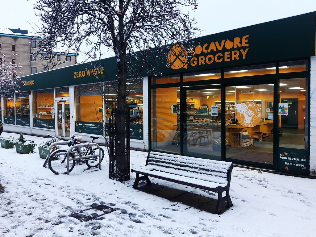 Offers fresh, local, and organic fruit & vegetables, loose organic grains, pulses, flours, herbs & spices, eco household cleaners, organic pantry goods, fresh bread from local bakeries. They have now also opened a cafe as part of the site. Reported closed January 2024.