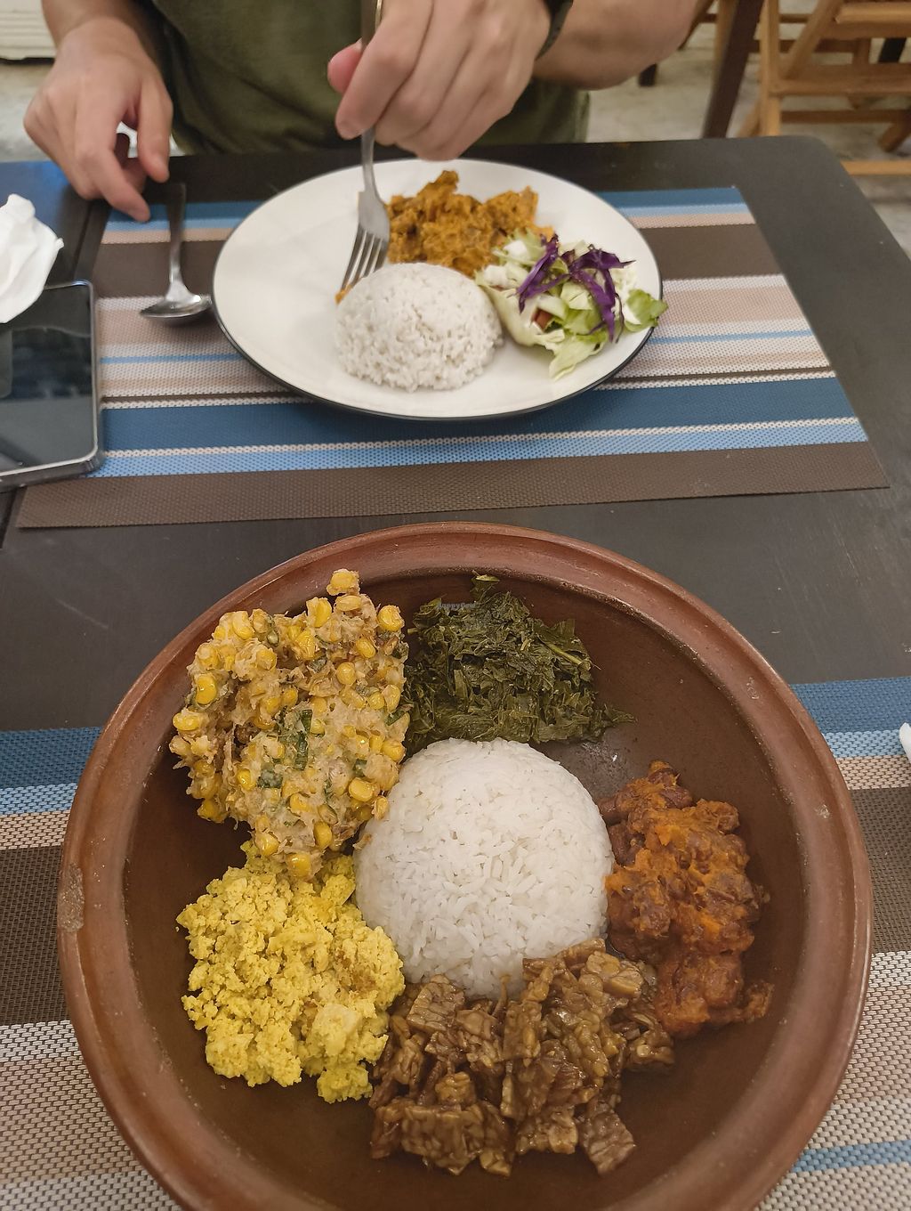 The menu has an extensive choice for vegans/veggies. They have a nasi campur option where you can choose all the elements to add to your nasi campur (like tofu,tempeh, curry, jackfruit/sweetcorn fritters etc.), which was so fun and really delicious. Plus, it’s amazing value for money - in my picture, the meal came to 45k! Pretty cheap for the crazy amount of food you get. The food took a while to come but i think we got unlucky as there was a big table waiting before us. Would highly recommend and the restaurant setting Is really nice. Seems to be connected to a hotel.