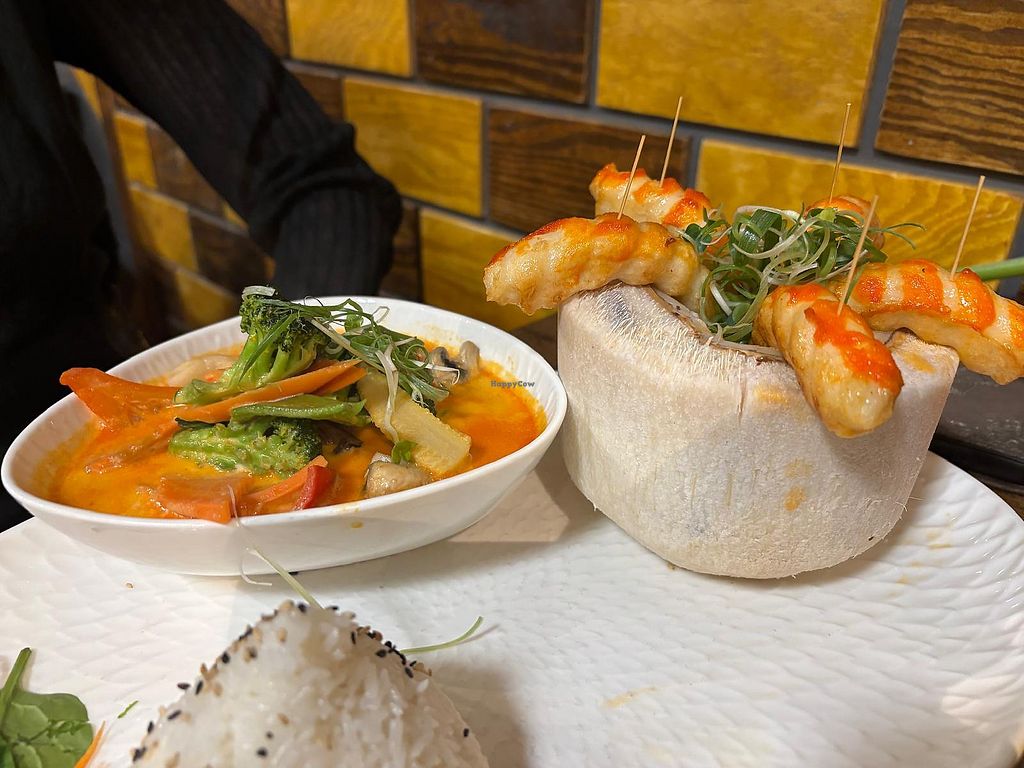 Vegane Riesengarnelen in einer Kokosnuss serviert,dazu Reis Thai Curry…