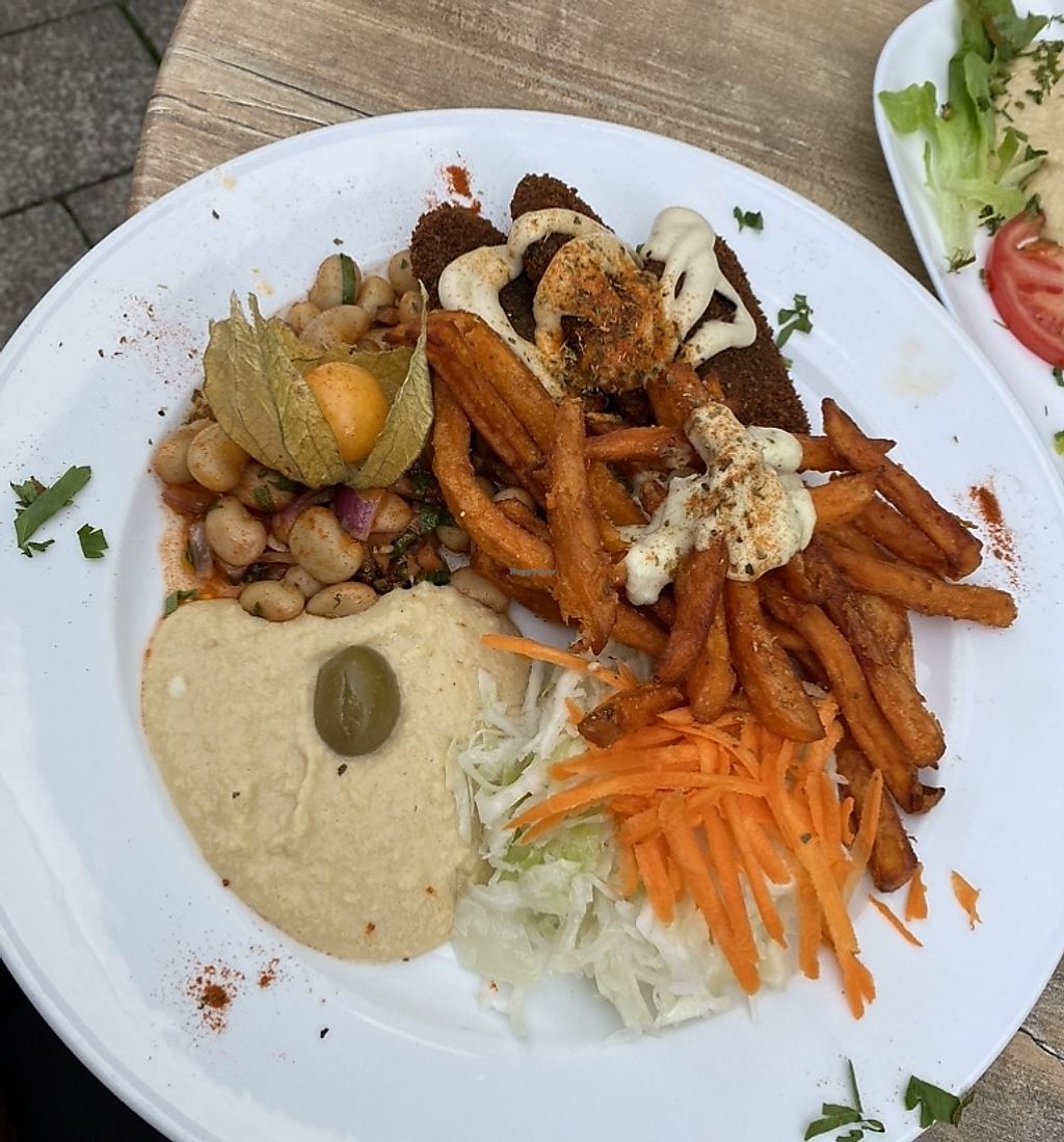 Vegan Frikadellen Teller with sweet potato fries instead of wedges (16…