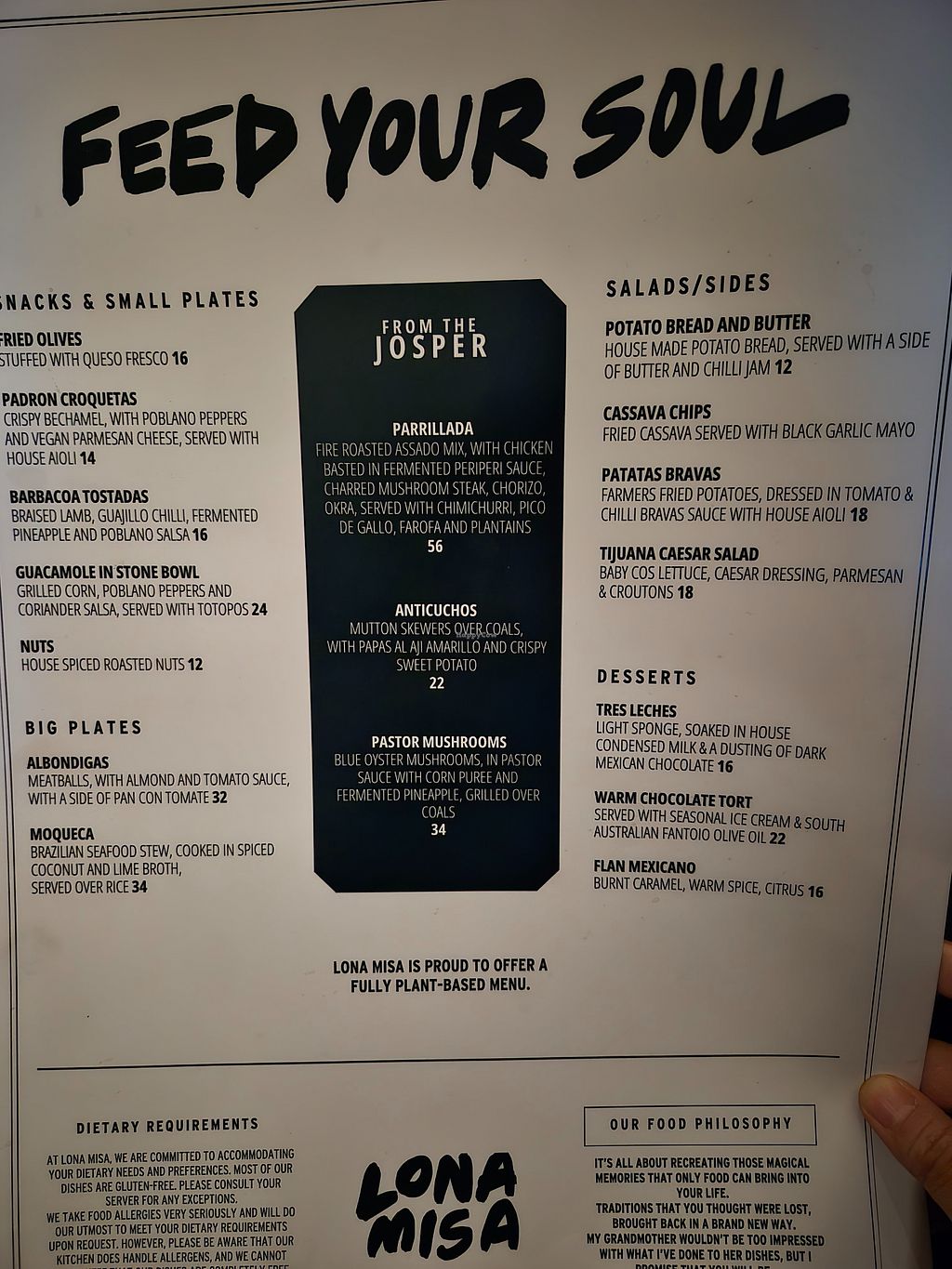 Had the set menu at Lona Misa and was honestly blown away by the quality of the food. At $88 per head for food both the quality and quantity of food served was top tier, we loved everything about it. You can tell that the dishes selected were done so carefully and in a way so as to compliment each other, cannot speak higher of the food.