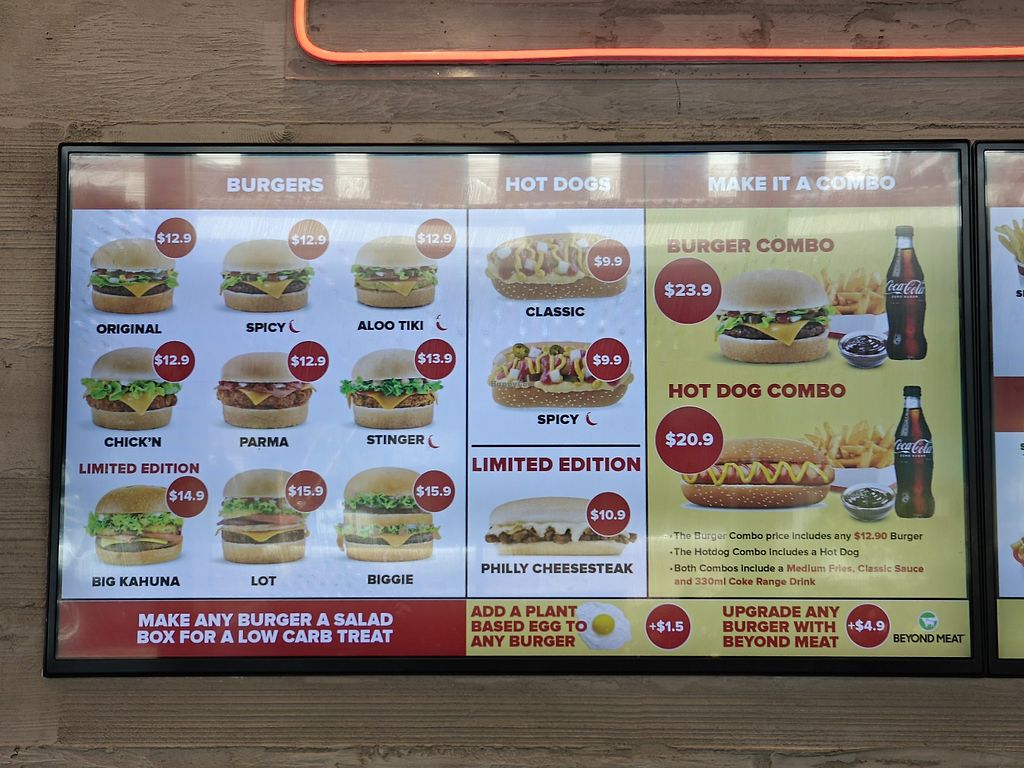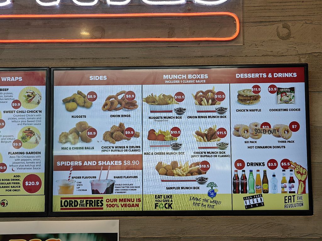 Australian vegan fast food franchise est.2004, with stores throughout Australia and New Zealand. Menu includes burgers, hot dogs, nuggets, onion rings, fries, all-day breakfast foods, as well as shakes and ice cream. Check website for hours. This branch reported permanently closed November 2024.