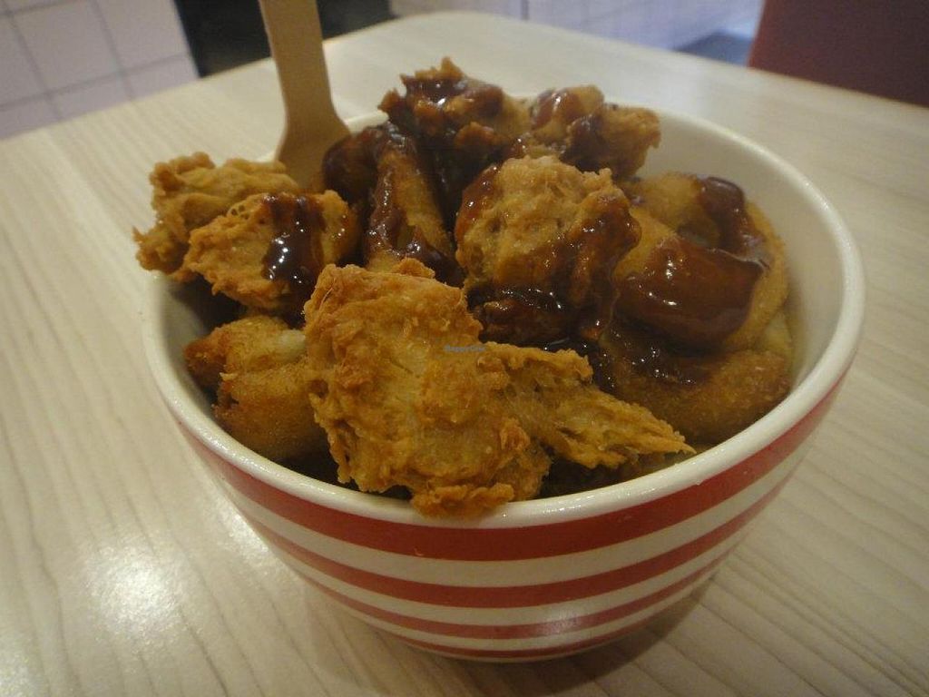 Great place to come to for a junk food fix! They have 4 different kinds of fries, as well as burgers, hot dogs, an all-day breakfast menu and a variety of desserts. It's nice to have a fully vegan place that's exclusively junk food. The late-night opening hours make it perfect for a midnight snack. It's a bit expensive for the portion sizes that you get, but that can just be said for the American-style food. They change their menu quite often and have limited edition items - usually a smaller portion and a bit more overpriced than their regular stuff. This location always has people around it because it's so central, so it sometimes takes a while to get your food, but the staff are always friendly - even when it's late at night! Would recommend the nuggets, especially now that they've changed their recipe, and the breakfast menu is pretty good too! The shakes are very rich and sweet, so if that's what you like, then they'd be really nice, but they aren't too thick so nothing too special there. I often get the nugget and fries munch box with chunky fries! They also have a really good range of sauces, now all vegan, but I usually just stick to tomato sauce because the other sauces cost extra.
