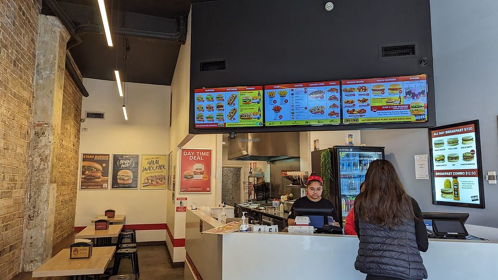 Very quick and friendly service. Wish my wings and nuggets came with sauces, maybe there was a free sauce station but didn’t look while in store. Food is very fast food-y and obviously a bit more pricy than non vegan fast food, but they have some value burger options too!! $6 for a value burger and 7.50 for their breakfast menu items! LOVE THIS PLACE