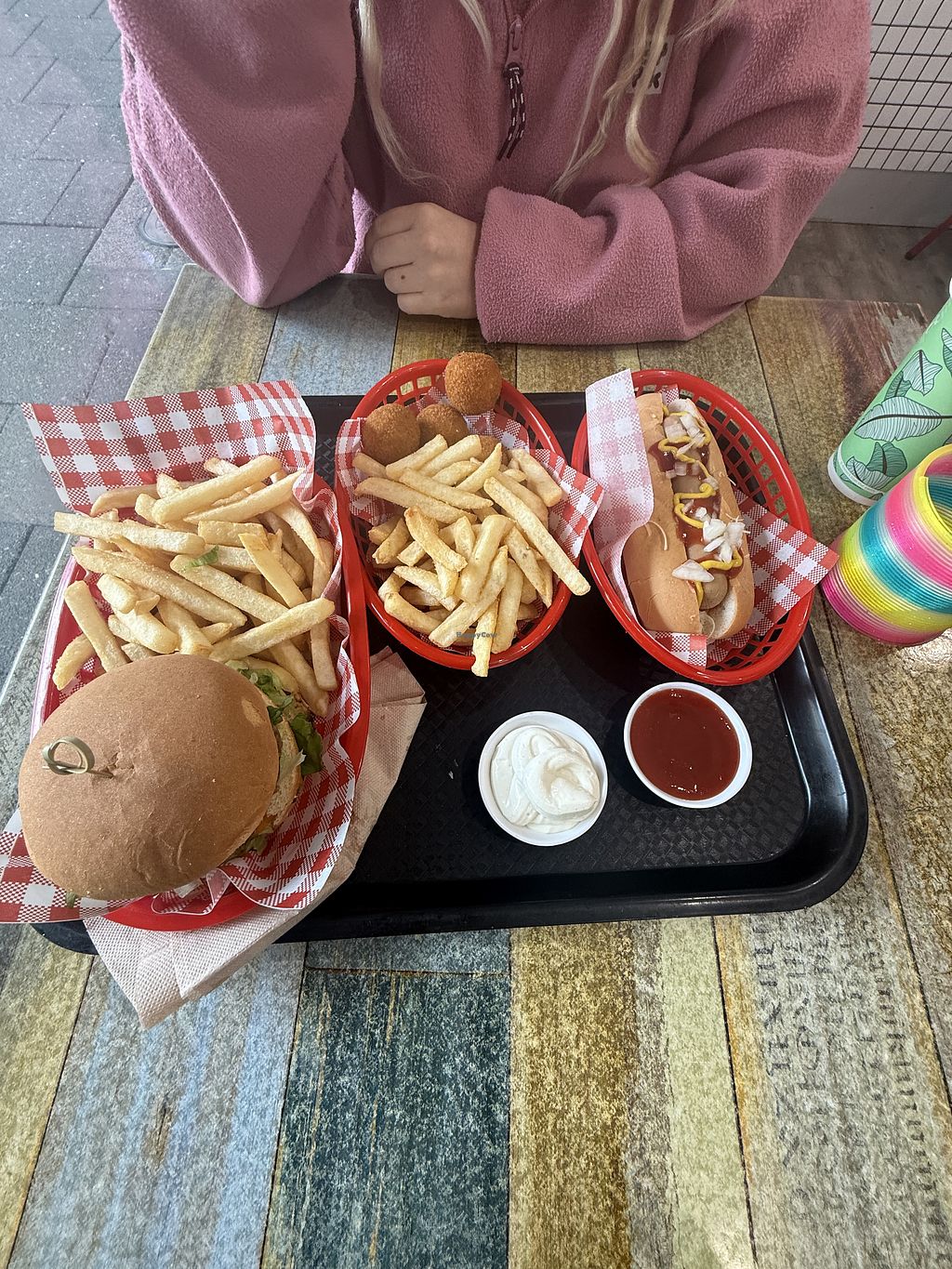 Enjoyed the food I had spicy burger, nuggets, chips and peanut smoothie. My only critique of the food is that the chips were too salty and that the ketchup and other sauces should be free!