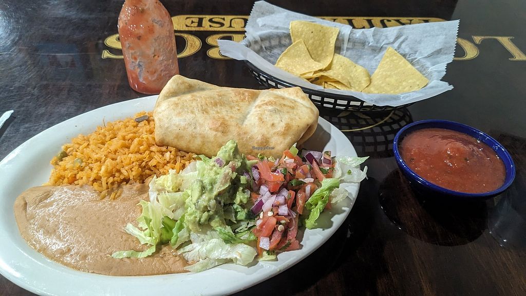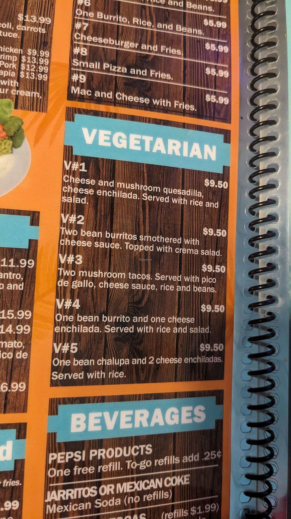 Serves meat, vegan options available. Mexican restaurant with some dishes that can be made vegan upon request by asking to remove cheese or sour cream, including mushroom tacos, bean burritos, and vegetable chimichangas. Open Tue-Thu 11:00am-9:00pm, Fri-Sat 11:00am-10:00pm, Sun 11:00am-8:00pm. Closed Mon.