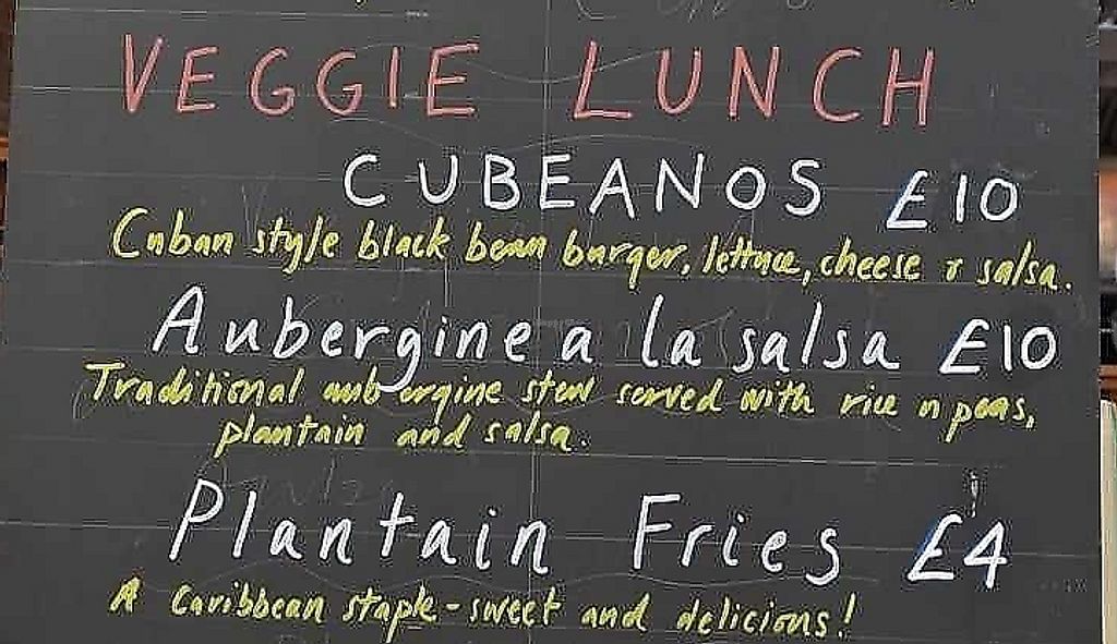 Serves meat, vegan options available. Cuban restaurant offering a few items that are or can be made vegan such as fried plantains, black bean burger and aubergine a la salsa. Open Mon-Wed 10:30-17:00, Thu 10:30-18:00, Fri 10:30-19:00, Sat 10:30-18:00, Sun 11:00-16:30.