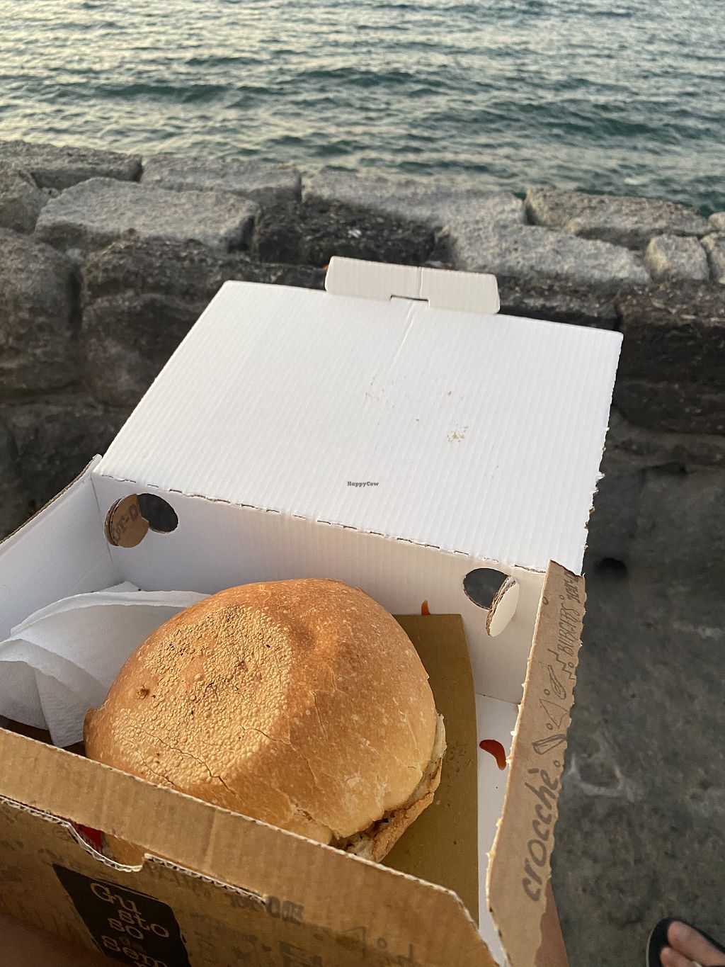 They had a vegan burger “hamburger vegano” on the menu (not on the big menu outside, but it’s on the menu inside and on the website), so we took two for take-away. It was actually just a burger and bun, without sauce or anything else. So pretty dry! I put some ketchup on it myself. If you order the vegan burger here, I would ask for extra lettuce and tomatoes or something. They also had vegan onion rings.