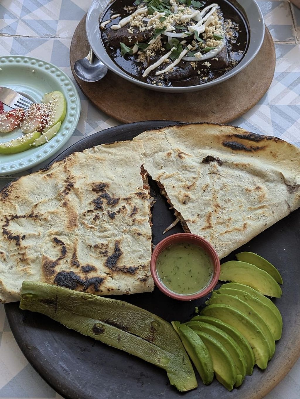 All food is vegan. As moles is a typical Oaxaca dish, i choose the degustacion of 3 moles $150 3 different sauces served with rice and tortillas. When i got the dish, i had to doublecheck that there was nochicken in the sauces... They were mushrooms, but at first look, i got quite worried. Loved the 3 moles. The restaurant is inside the door and upstairs in a lovely green terrace
