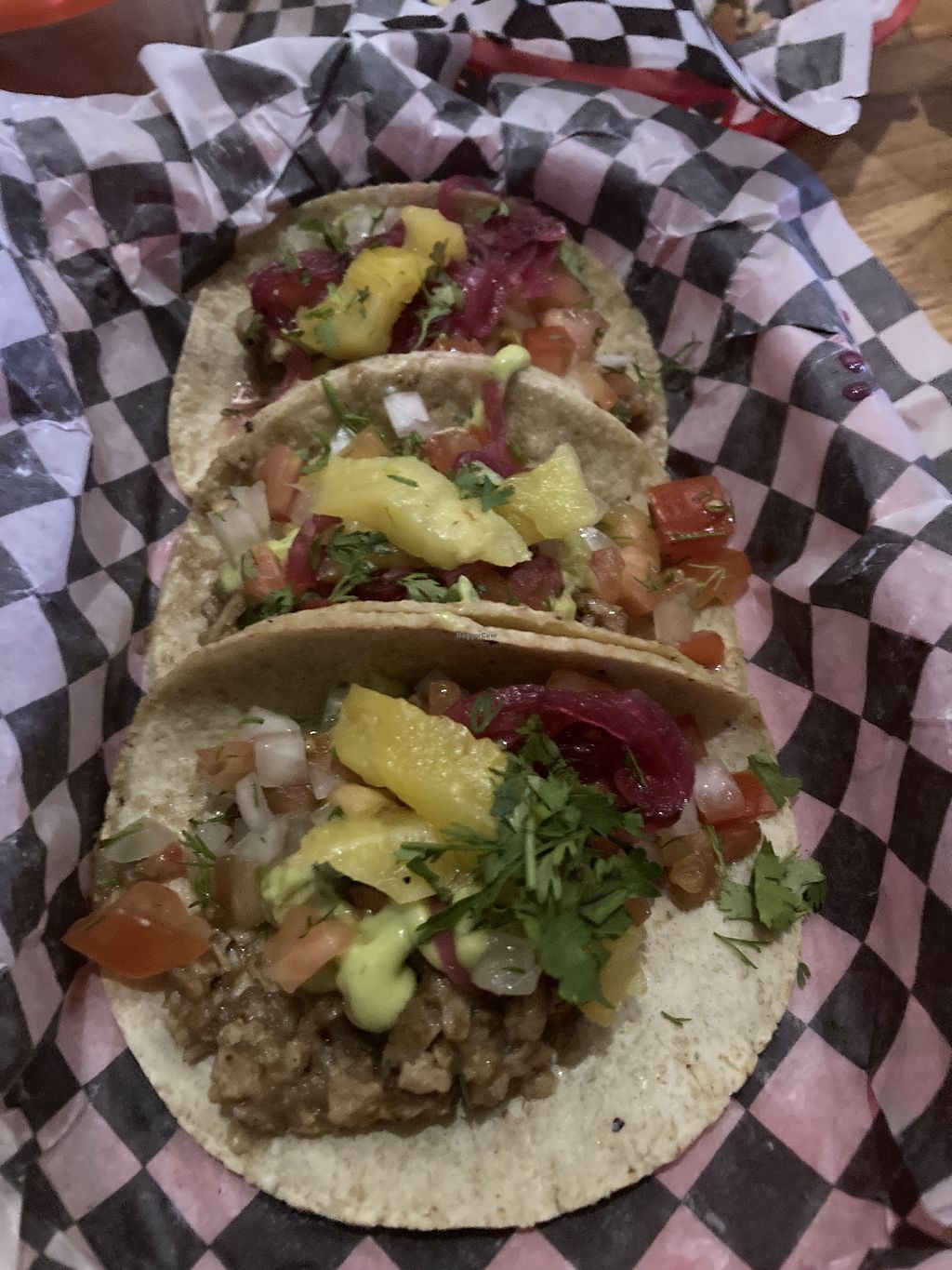 Soy based mince tacos. Like other reviews just asked for without cheese. Server even said vegan. They were tasty and came out fast, could have about 10!!