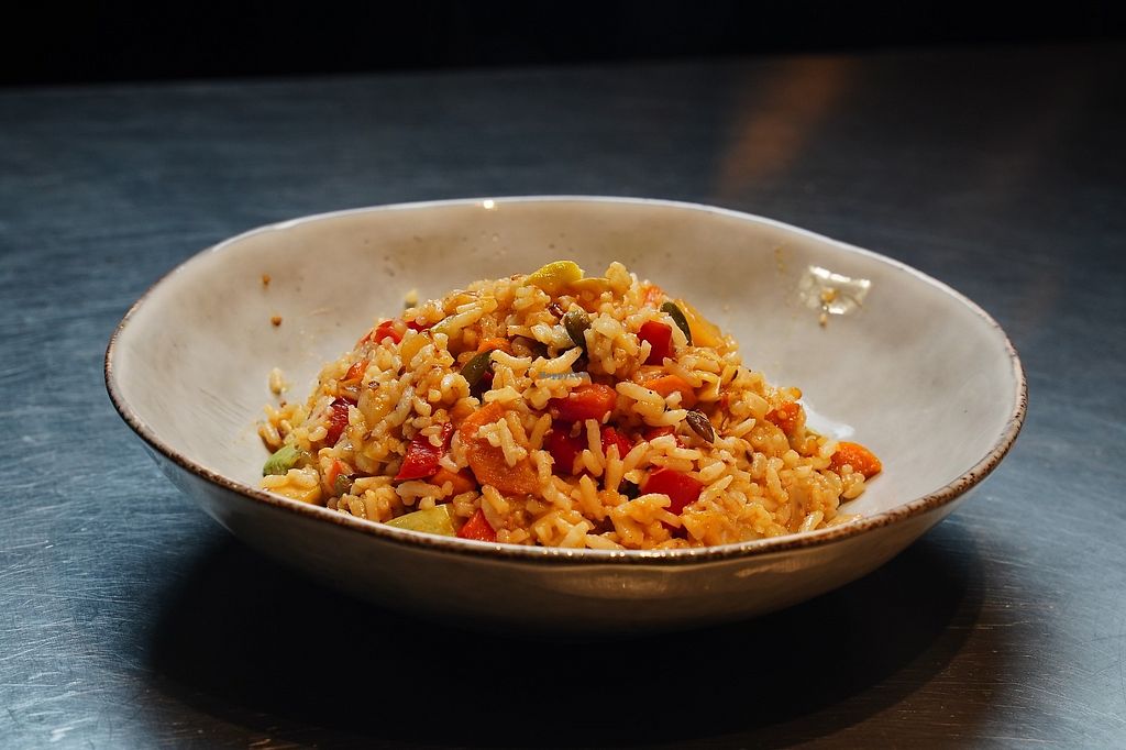 Read moreDe segundo un wok de arroz con verduras y un plato de flor de plátano con arroz.