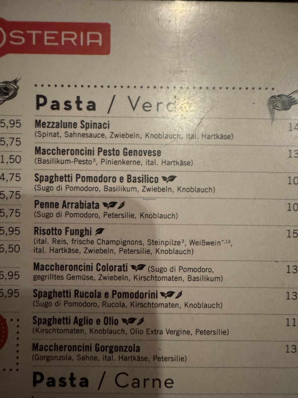 Menu (vegetarian/vegan pasta).
